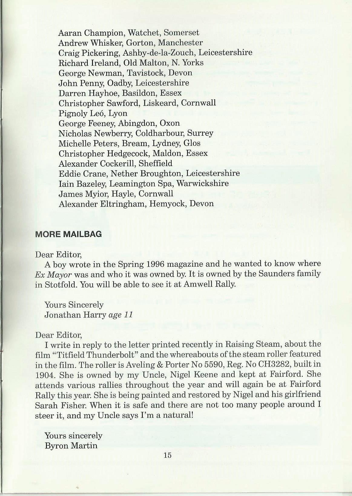 A boy wrote in the Spring 1996 magazine and he wanted to know where Ex Mayor was and who it was owned by. It is owned by the Saunders family in Stotfold. You will be able to see it at Amwell Rally.