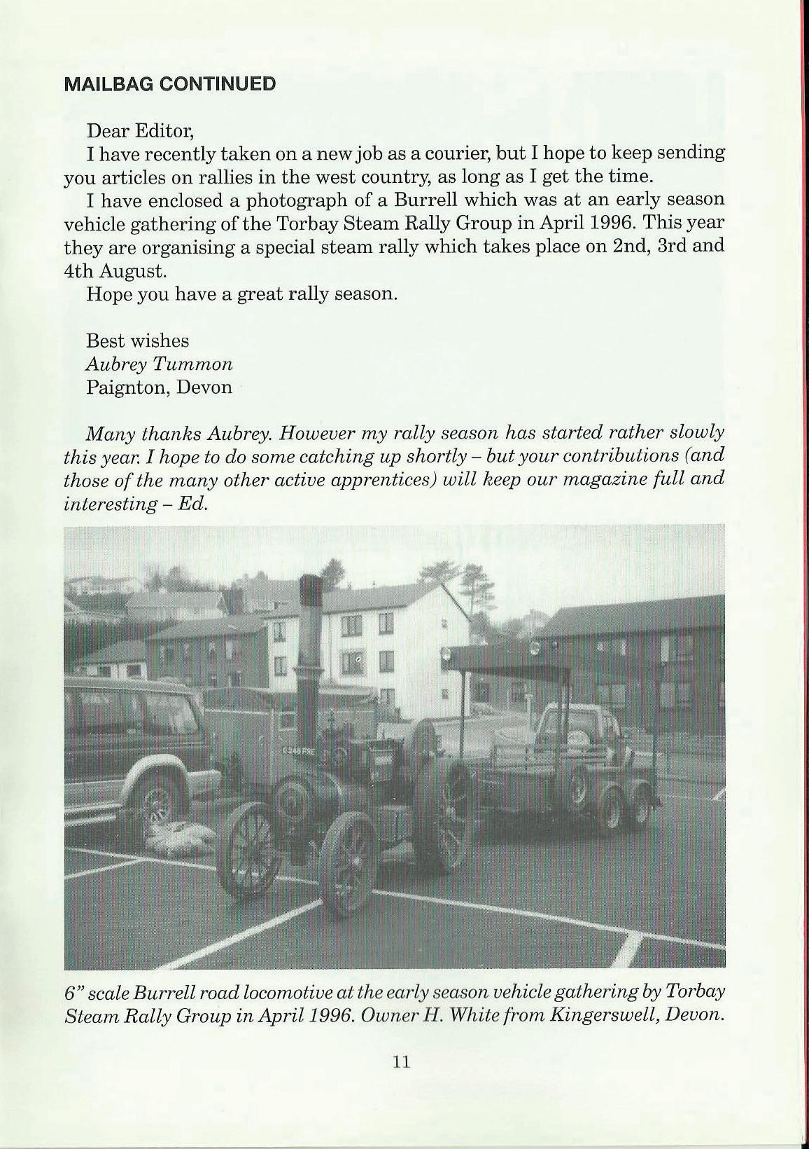 I have enclosed a photograph of a Burrell which was at an early season vehicle gathering of the Torbay Steam Rally Group in April 1996. This year they are organising a special steam rally which takes place on 2nd, 3rd and 4th August.