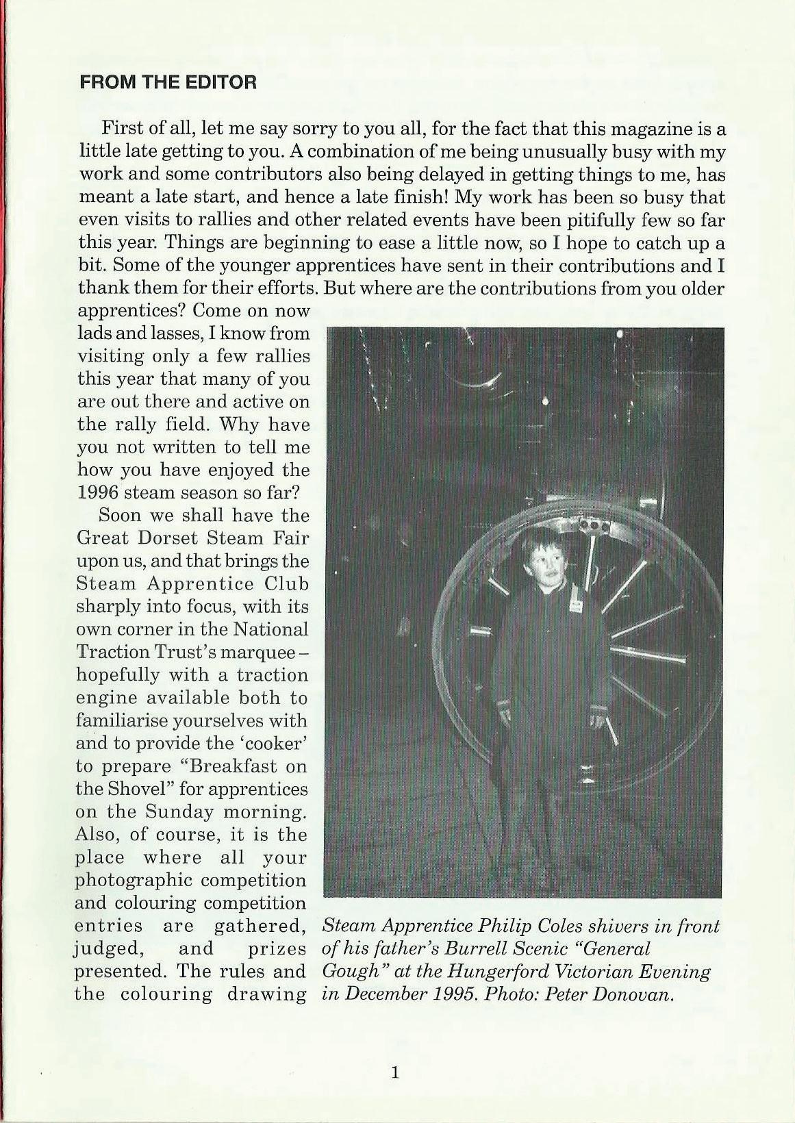 First of all, let me say sorry to you all, for the fact that this magazine is a little late getting to you. A combination of me being unusually busy with my work and some contributors also being delayed in getting things to me, has meant a late start, and hence a late finish! My work has been so busy that even visits to rallies and other related events have been pitifully few so far this year. Things are beginning to ease a little now, so I hope to catch up a bit. Some of the younger apprentices have sent in their contributions and I thank them for their efforts. But where are the contributions from you older apprentices? Come on now lads and lasses, I know from visiting only a few rallies this year that many of you are out there and active on the rally field. Why have you not written to tell me how you have enjoyed the 1996 steam season so far? Soon we shall have the Great Dorset Steam Fair upon us, and that brings the Steam Apprentice Club sharply into focus, with its own corner in the National Traction Trust's marqueehopefully with a traction engine available both to familiarise yourselves with arid to provide the 'cooker' to prepare "Breakfast on the Shovel" for apprentices on the Sunday morning. Also, of course, it is the place where all your photographic cornpetition and colouring competition entries are gathered, Steam Apprentice Philip Coles shivers in front judged, and prizes of his father's Burrell Scenic "General presented. The rules and Gough" at the Hungerford Victorian Evening the colouring drawing in December 1995. Photo: Peter Donovan.
