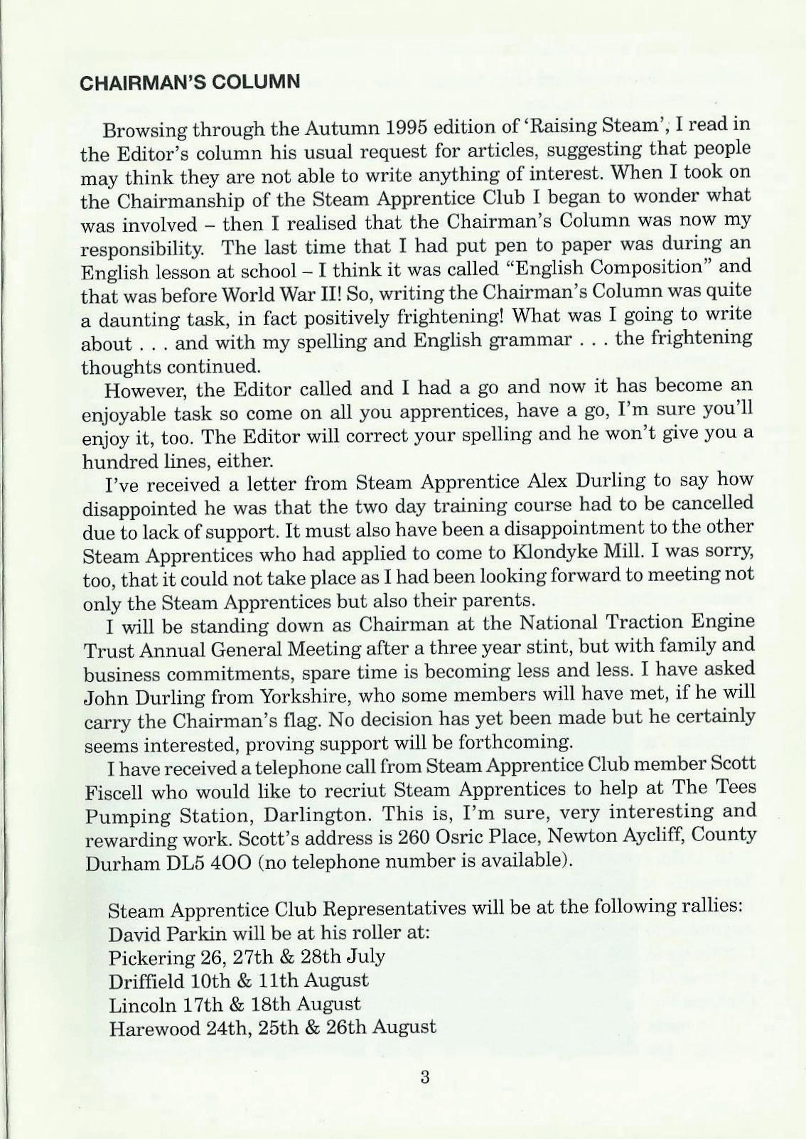 Browsing through the Autumn 1995 edition of 'Raising Steam', I read in the Editor's column his usual request for articles, suggesting that people may think they are not able to write anything of interest. When I took on the Chairmanship of the Steam Apprentice Club I began to wonder what was involved - then I realised that the Chairman's Column was now my responsibility. The last time that I had put pen to paper was during an English lesson at school - I think it was called "English Composition" and that was before World War II! So, writing the Chairman's Column was quite a daunting task, in fact positively frightening! What was I going to write about ... and with my spelling and English grammar ... the frightening thoughts continued.