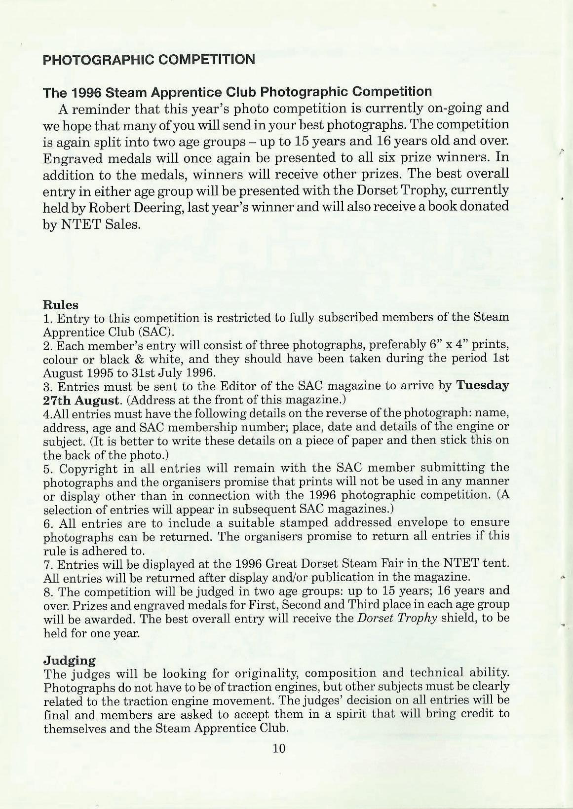 7. Entries will be displayed at the 1996 Great Dorset Steam Fair in.the NTET tent. All entries will be returned after display and/or publication in the magazine.