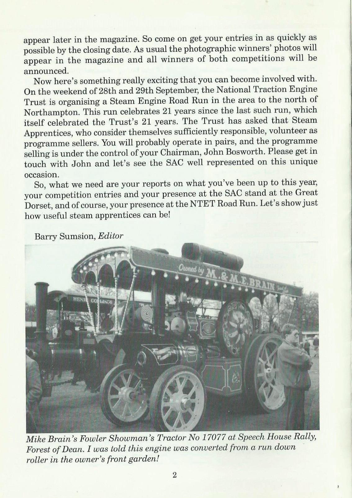 Now here's something really exciting that you can become involved with. On the weekend of 28th and 29th September, the National Traction Engine Trust is organising a Steam Engine Road Run in the area to the north of Northampton. This run celebrates 21 years since the last such run, which itself celebrated the Trust's 21 years. The Trust has asked that Steam Apprentices, who consider themselves sufficiently responsible, volunteer as programme sellers. You will probably operate in pairs, and the programme selling is under the control of your Chairman, John Bosworth. Please get in touch with John and let's see the SAC well represented on this unique occasion.