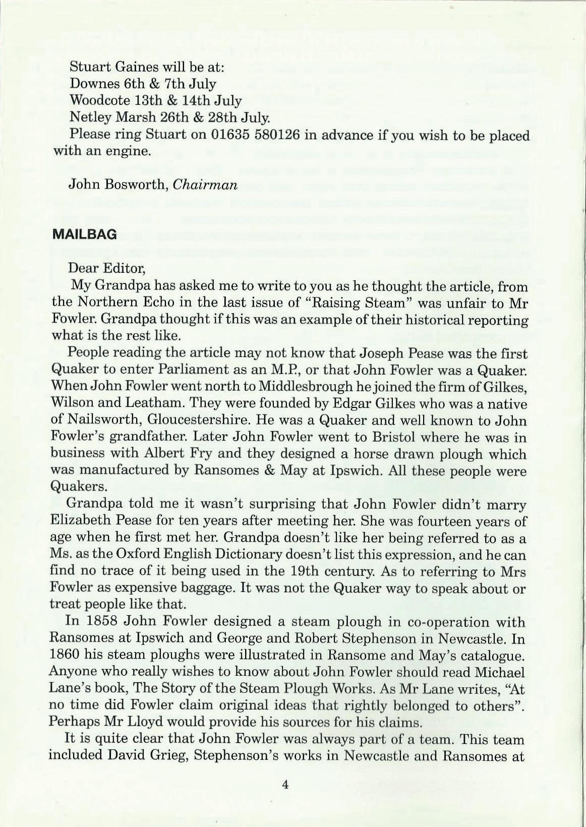 My Grandpa has asked me to write to you as he thought the article, from the Northern Echo in the last issue of "Raising Steam" was unfair to Mr Fowler. Grandpa thought if this was an example of their historical reporting what is the rest like.