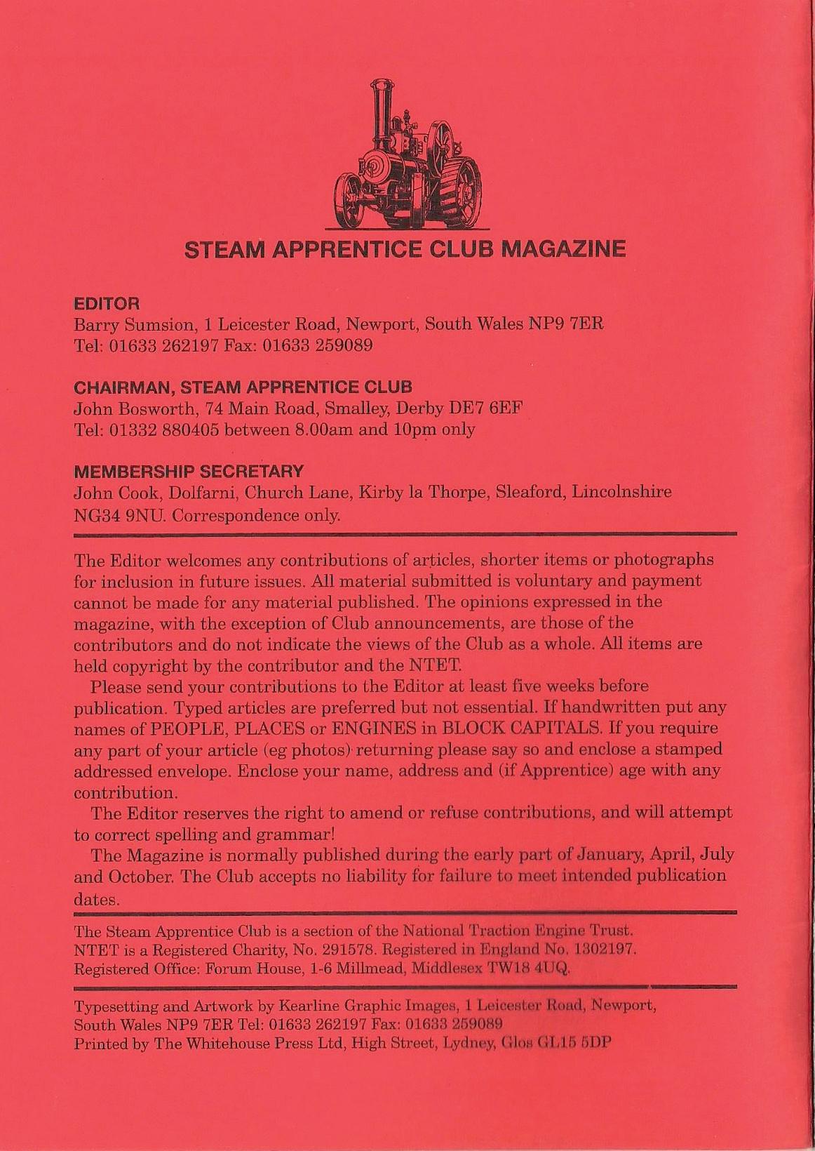 The Steam Apprentice Club is a section of the National rrraction Engine Tnist. NTET is a Registered Charity, No. 291578. Registered in Engb1ml No. l!-102197. Registered Office: Forum House, 1~6Millmead, Middlesex rrWlH <'IUQ.