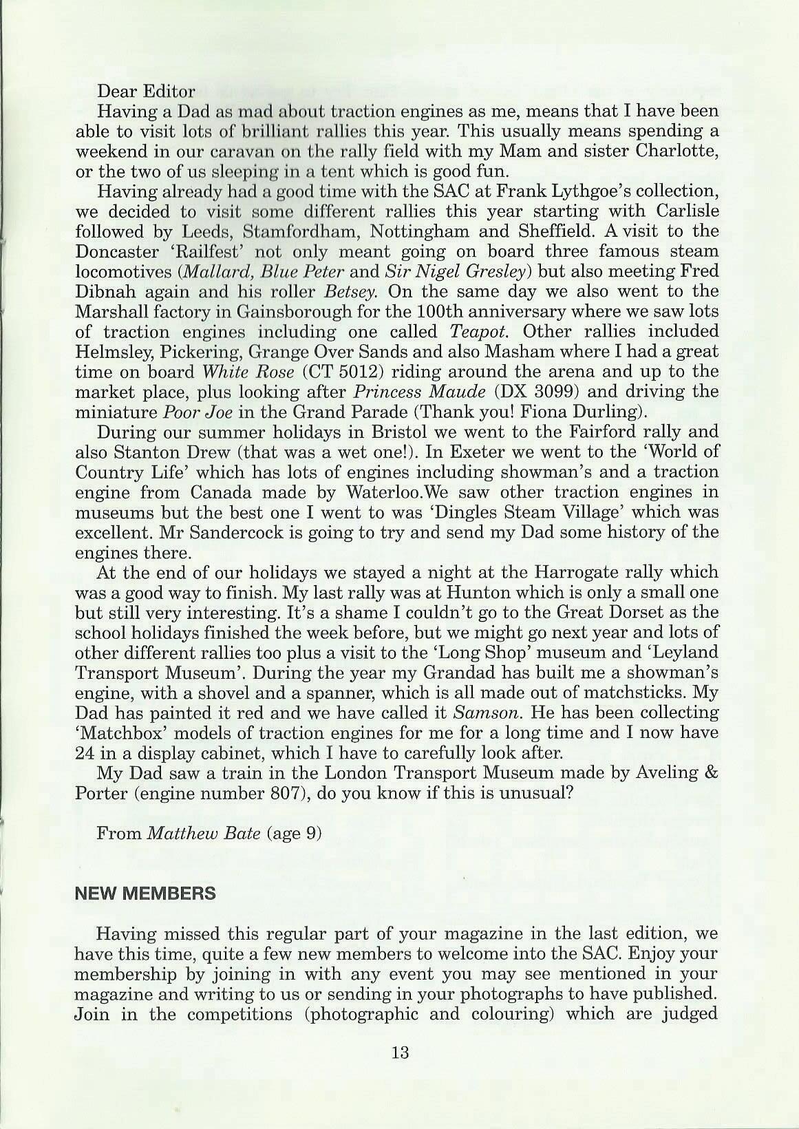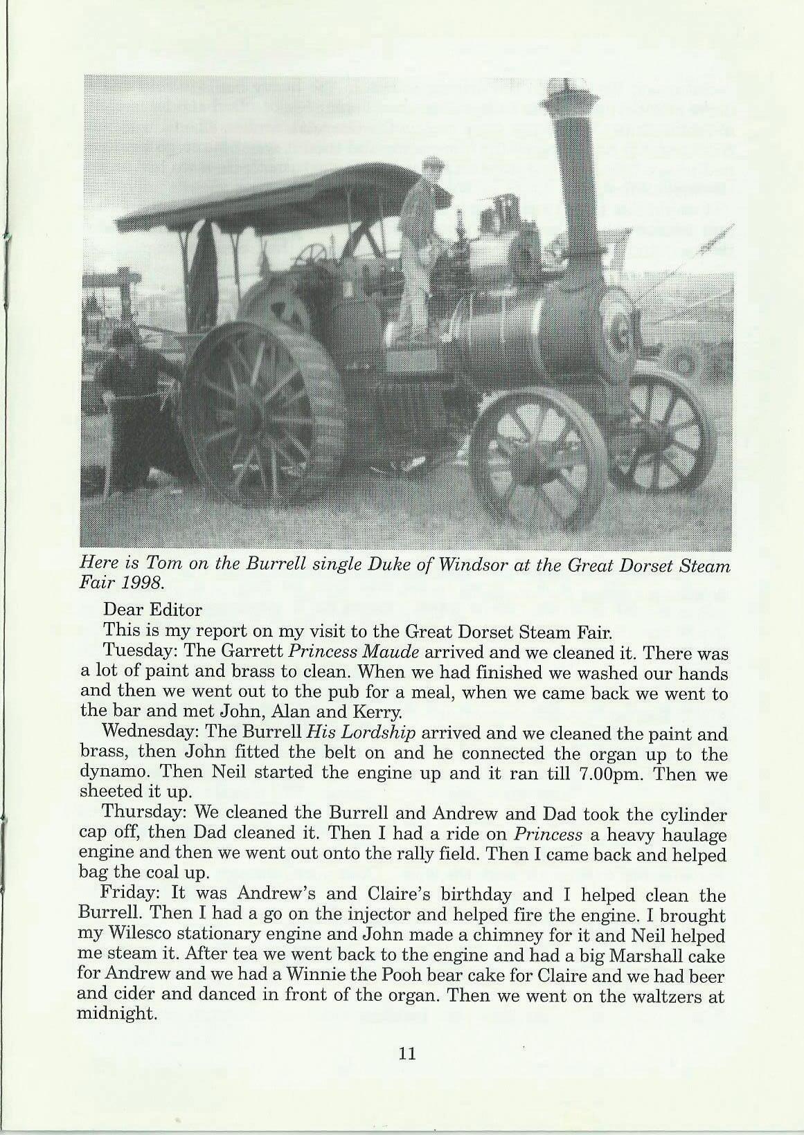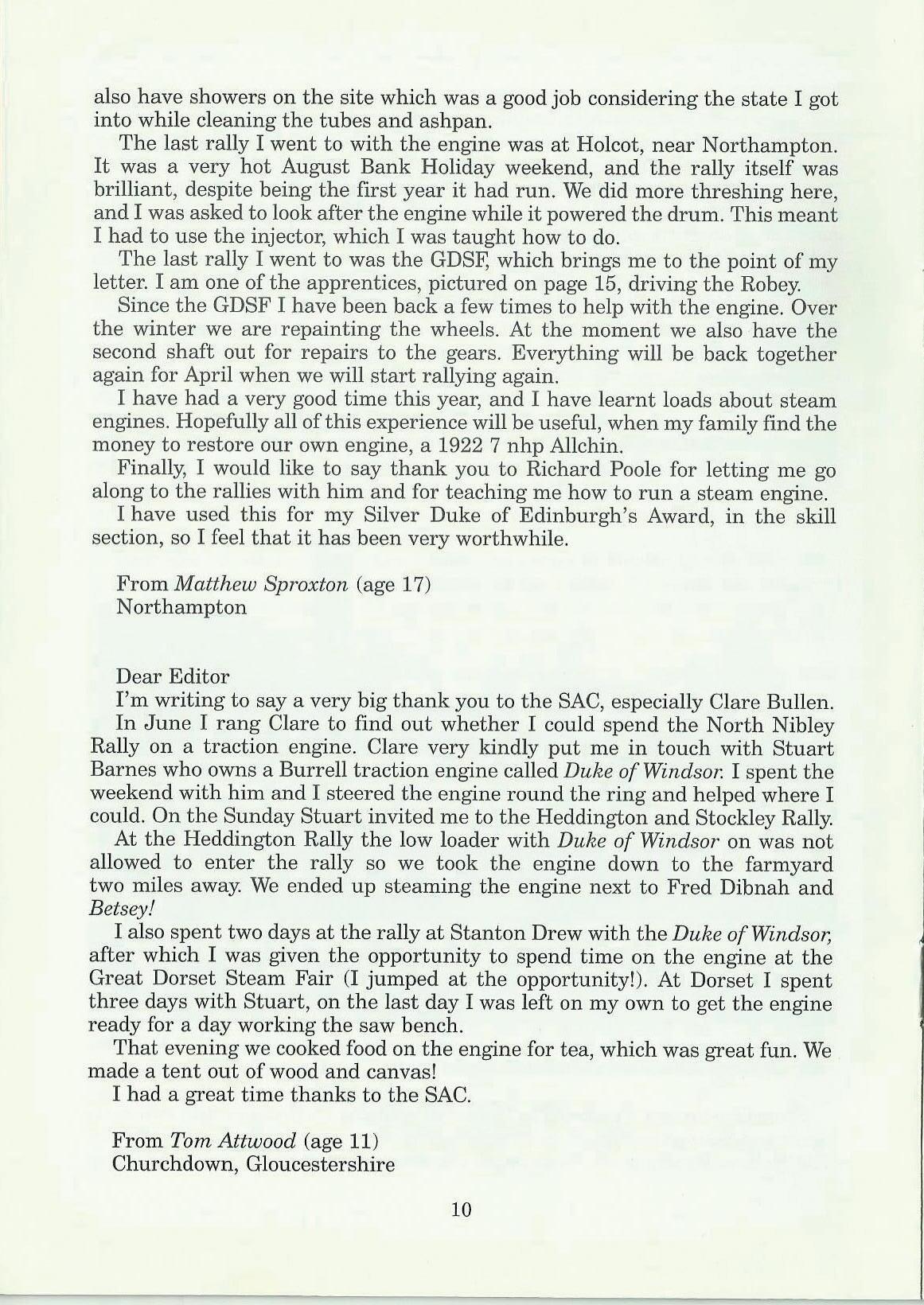I'm writing to say a very big thank you to the SAC, especially Clare Bullen. In June I rang Clare to find out whether I could spend the North Nibley Rally on a traction engine. Clare very kindly put me in touch with Stuart Barnes who owns a Burrell traction engine called Duke of Windsor. I spent the weekend with him and I steered the engine round the ring and helped where I could. On the Sunday Stuart invited me to the Reddington and Stockley Rally. At the Heddington Rally the low loader with Duke of Windsor on was not allowed to enter the rally so we took the engine down to the farmyard two miles away. We ended up steaming the engine next to Fred Dibnah and Betsey!