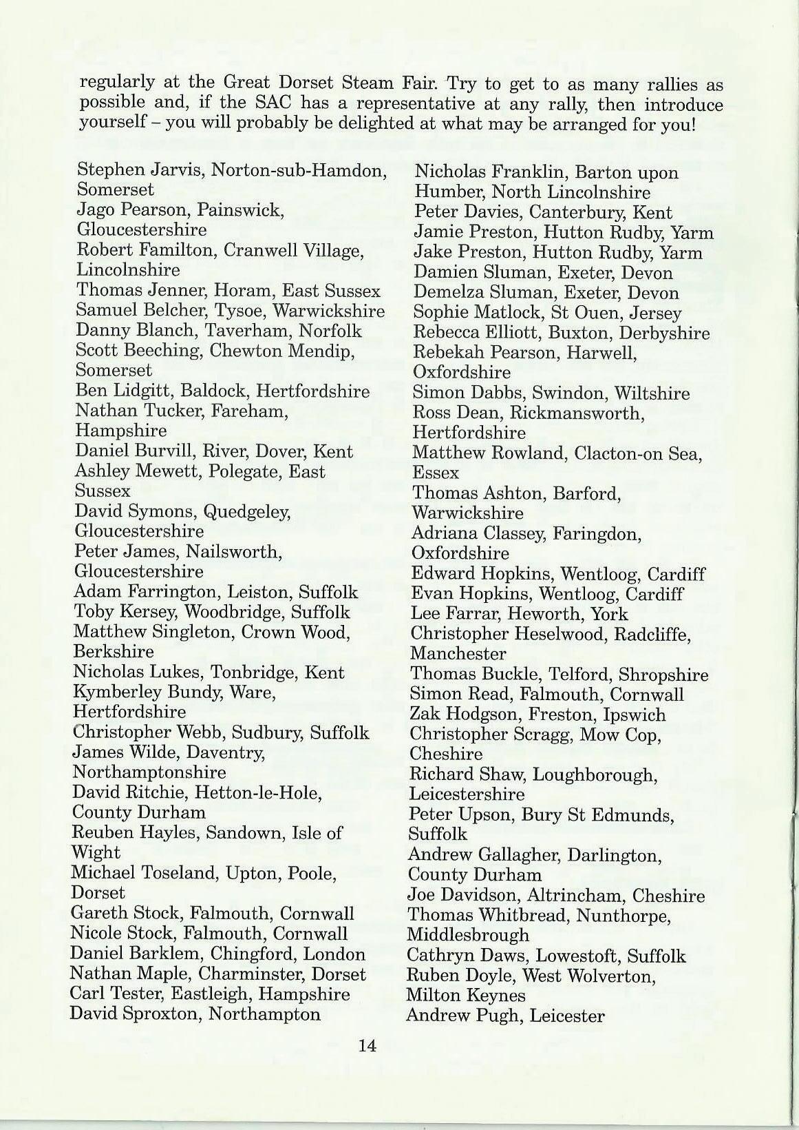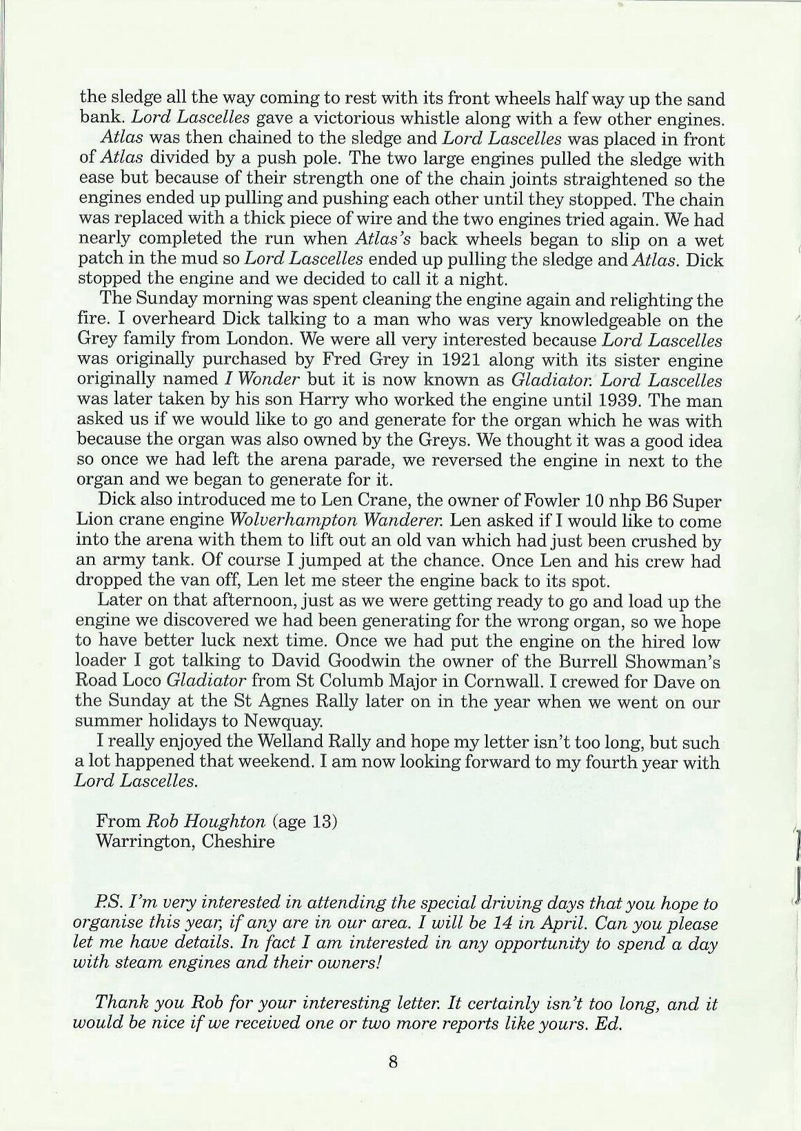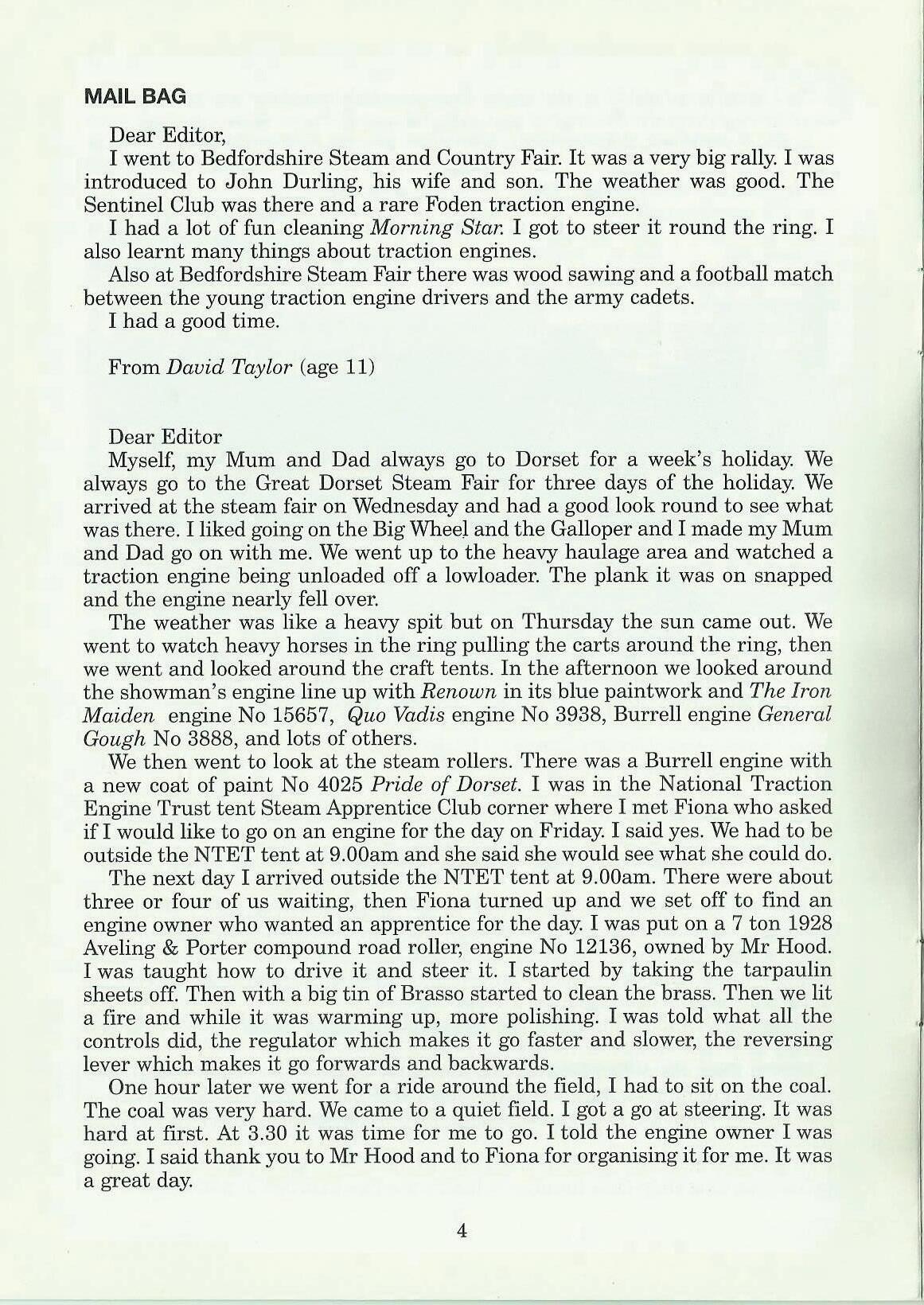 I'm writing to say a very big thank you to the SAC, especially Clare Bullen. In June I rang Clare to find out whether I could spend the North Nibley Rally on a traction engine. Clare very kindly put me in touch with Stuart Barnes who owns a Burrell traction engine called Duke of Windsor. I spent the weekend with him and I steered the engine round the ring and helped where I could. On the Sunday Stuart invited me to the Reddington and Stockley Rally. At the Heddington Rally the low loader with Duke of Windsor on was not allowed to enter the rally so we took the engine down to the farmyard two miles away. We ended up steaming the engine next to Fred Dibnah and Betsey!