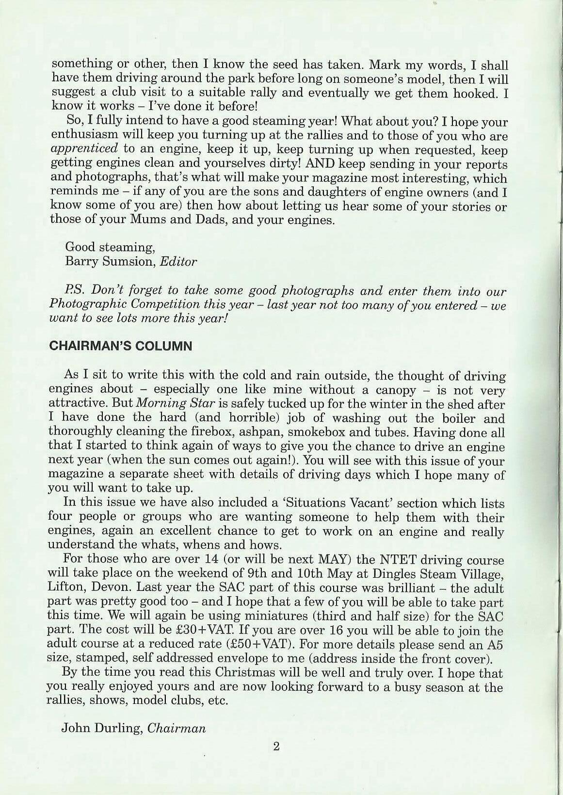 As I sit to write this with the cold and rain outside, the thought of driving engines about - especially one like mine without a canopy - is not very attractive. But Morning Star is safely tucked up for the winter in the shed after I have done the hard (and horrible) job of washing out the boiler and thoroughly cleaning the firebox, ashpan, smokebox and tubes. Having done all that I started to think again of ways to give you the chance to drive an engine next year (when the sun comes out again!). You will see with this issue of your magazine a separate sheet with details of driving days which I hope many of you will want to take up.