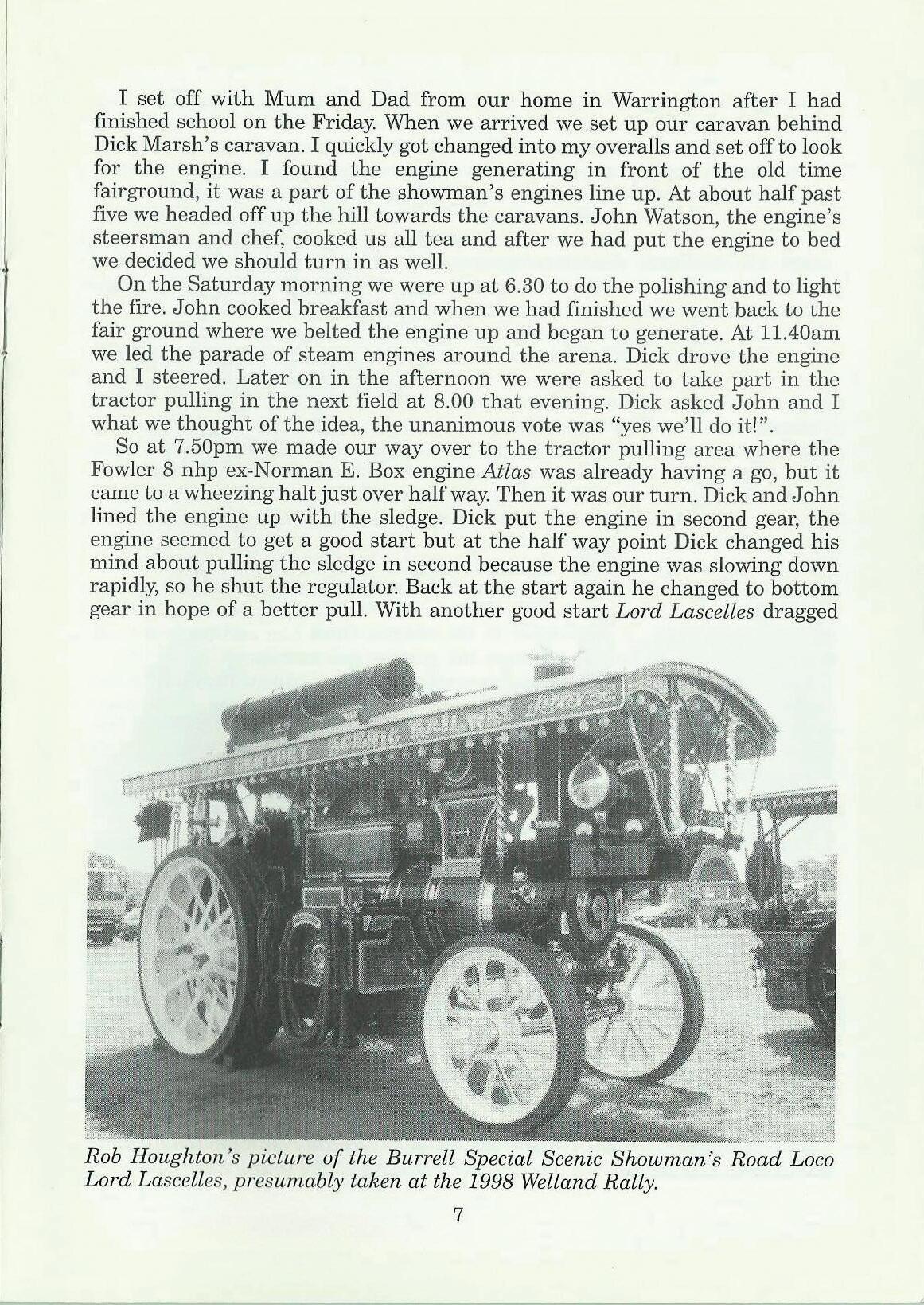 I'm writing to you to tell you about the 1998 Welland Steam Rally (near Upton upon Severn, Worcestershire). It was the first time I've been to this rally and it was also the first time the engine crew on Lord Lascelles, the Burrell 8 nhp Special Scenic Showman's road loco, had attended.