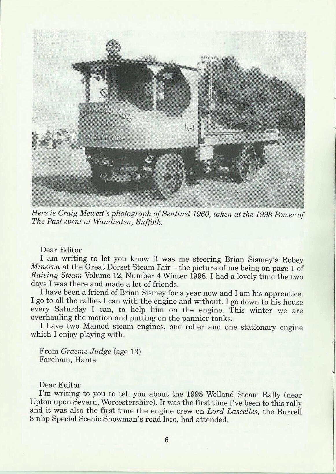 I am writing to let you know it was me steering Brian Sismey's Robey Minerva at the Great Dorset Steam Fair - the picture of me being on page 1 of Raising Steam Volume 12, Number 4 Winter 1998. I had a lovely time the two days I was there and made a lot of friends.