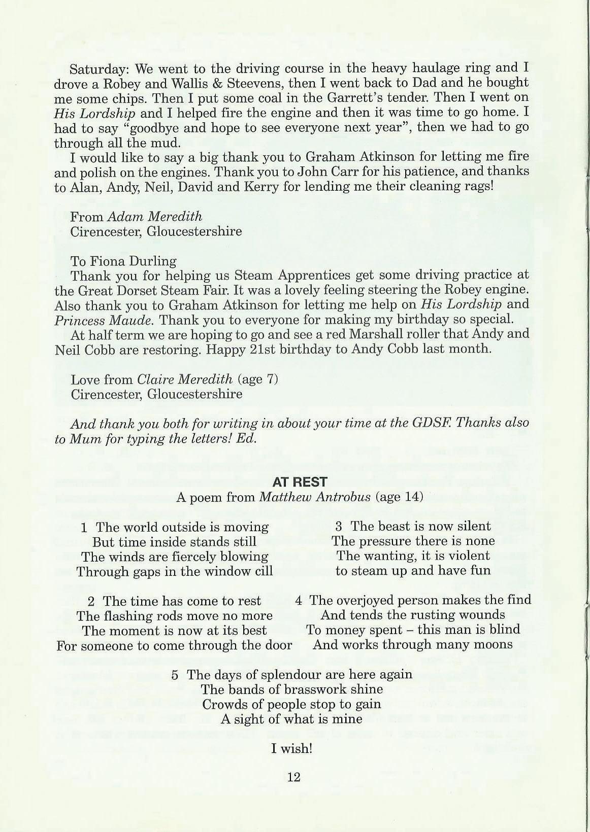 Finally, I would like to say thank you to Richard Poole for letting me go along to the rallies with him and for teaching me how to run a steam engine. I have used this for my Silver Duke of Edinburgh's Award, in the skill section, so I feel that it has been very worthwhile.