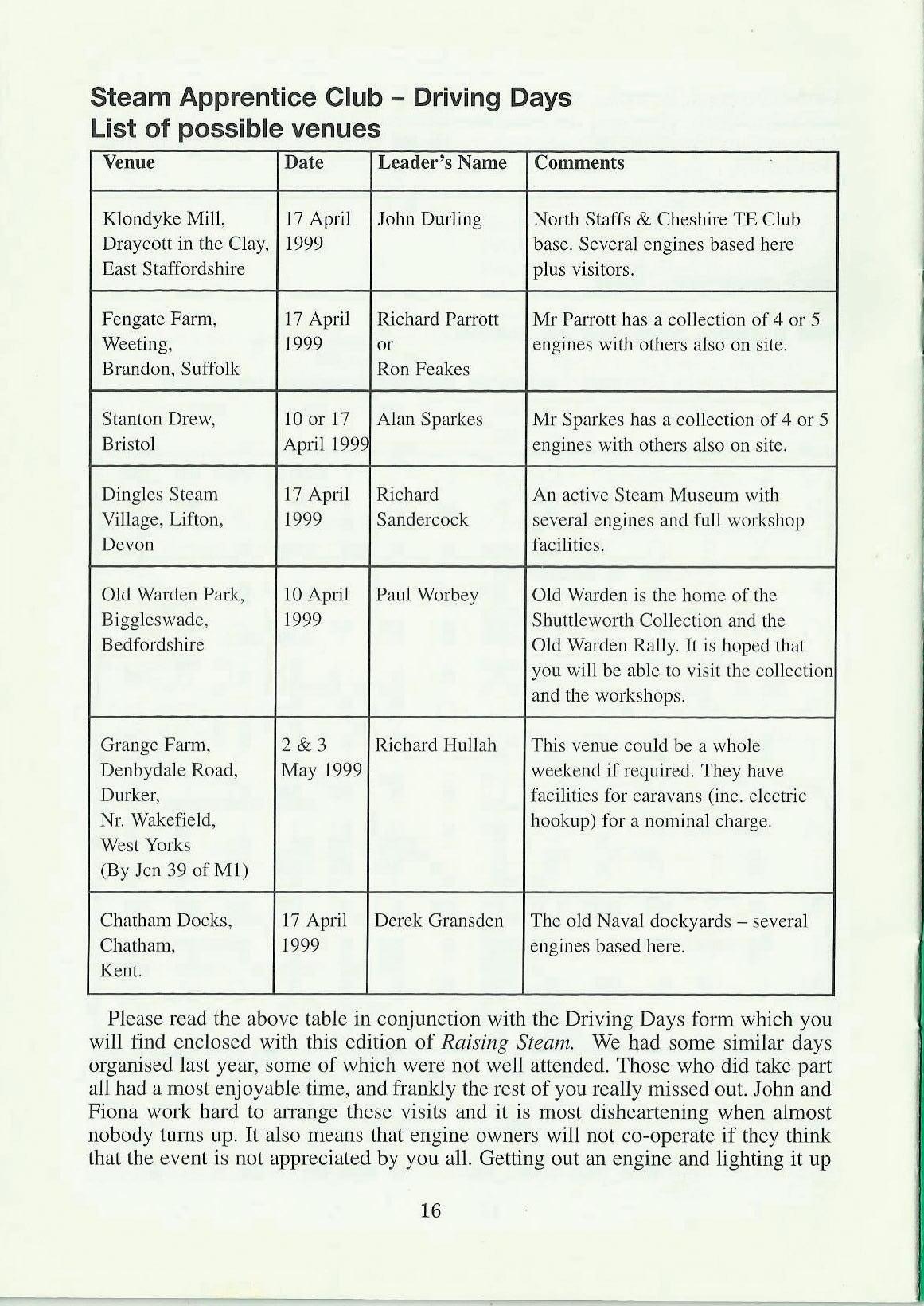Please read the above table in conjunction with the Driving Days form which you will find enclosed with this edition of Raising Steam. We had some similar days organised last year, some of which were not well attended. Those who did take part all had a most enjoyable time, and frankly the rest of you really missed out. John and Fiona work hard to a1Tange these visits and it is most disheartening when almost nobody turns up. It also means that engine owners will not co-operate if they think that the event is not appreciated by you all. Getting out an engine and lighting it up