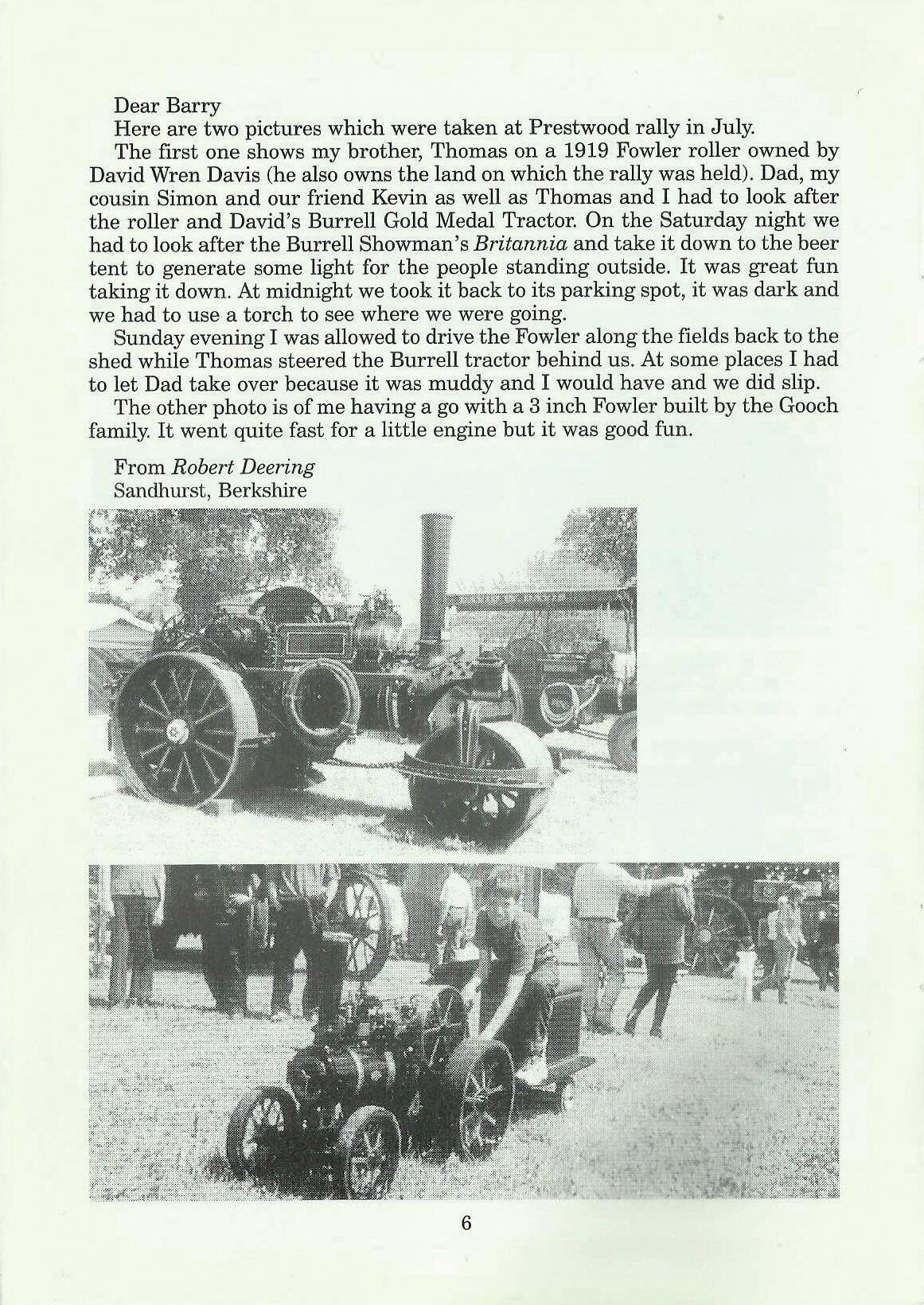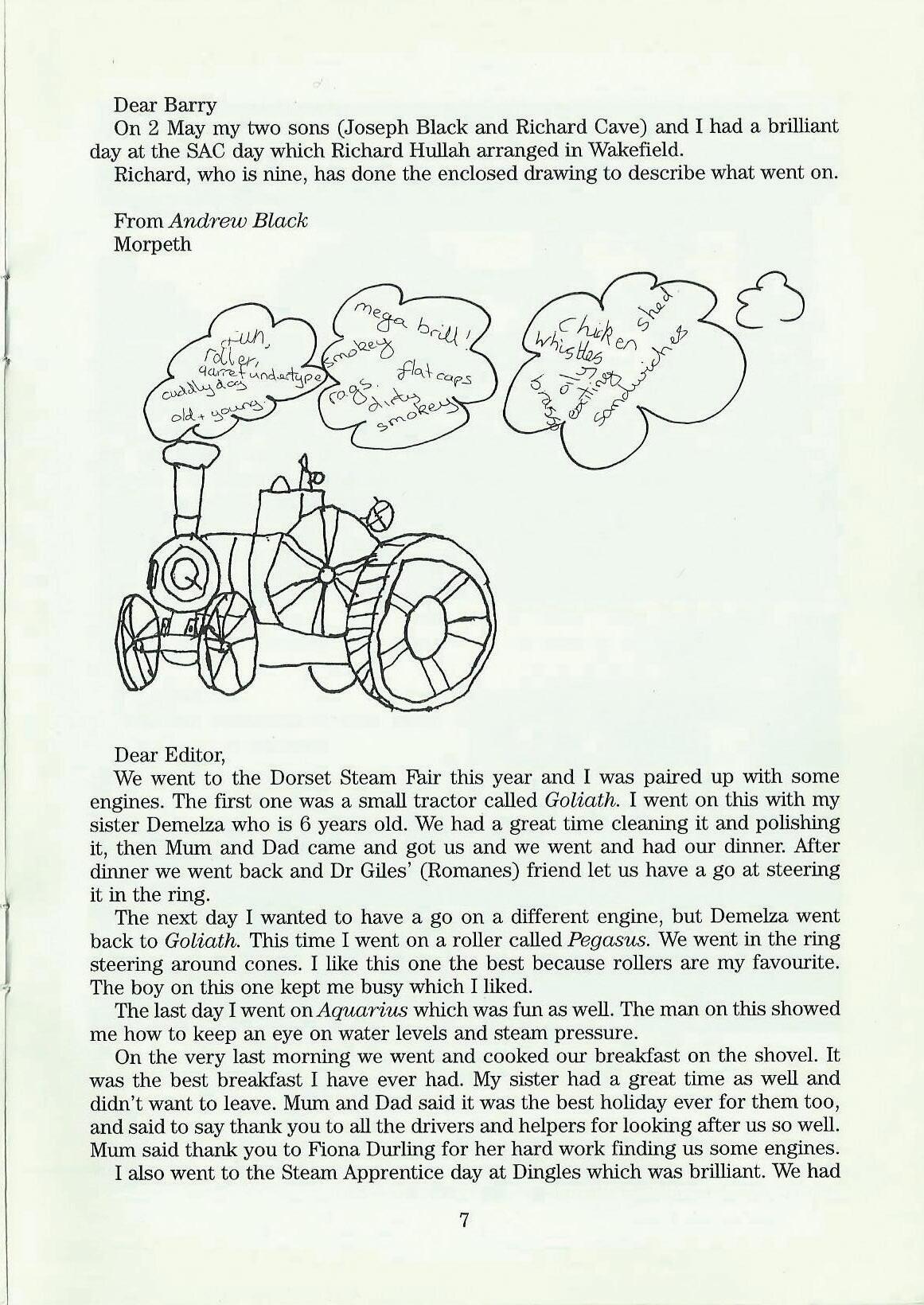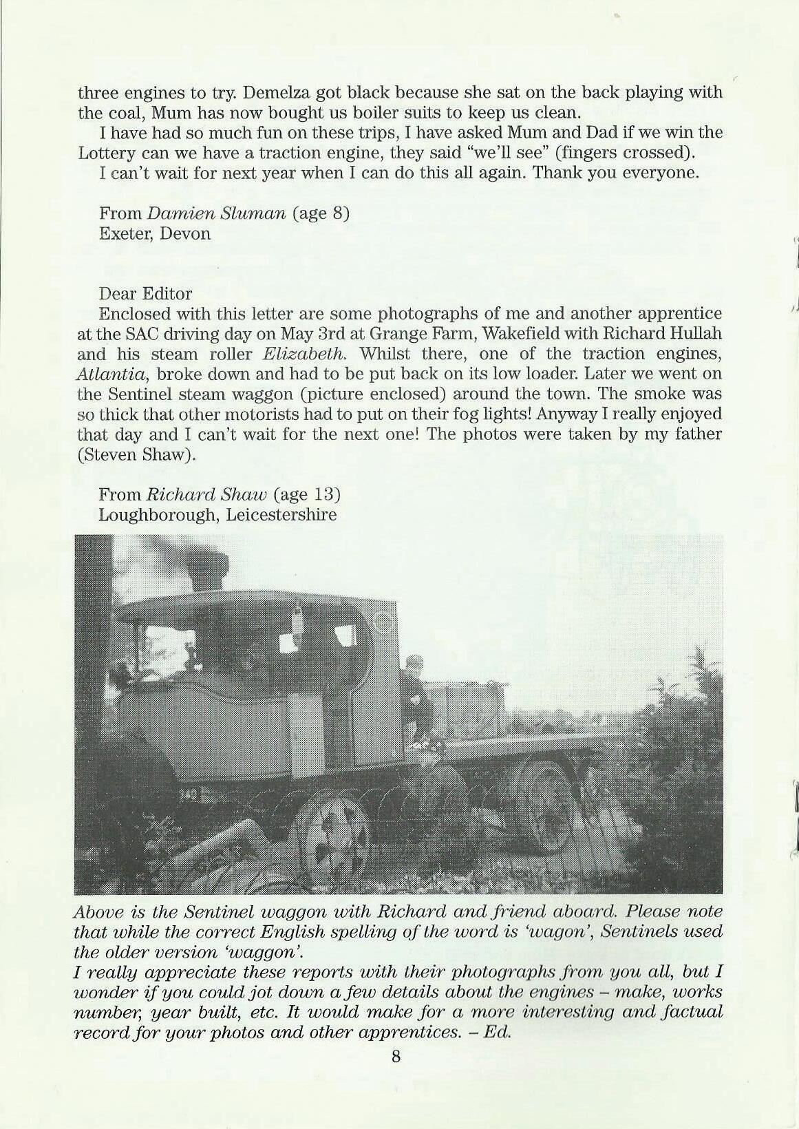 Enclosed with this letter are some photographs of me and another apprentice at the SAC driving day on May 3rd at Grange Farm, Wakefield with Richard Hullah and his steam roller Elizabeth. Whilst there, one of the traction engines, Atlantia, broke down and had to be put back on its low loader. Later we went on the Sentinel steam waggon (picture enclosed) around the town. The smoke was so thick that other motorists had to put on their fog lights! Anyway I really enjoyed that day and I can't wait for the next one! The photos were taken by my father (Steven Shaw).