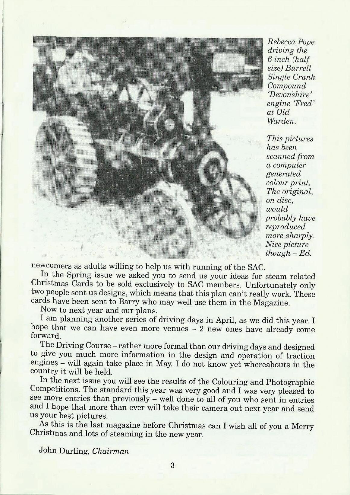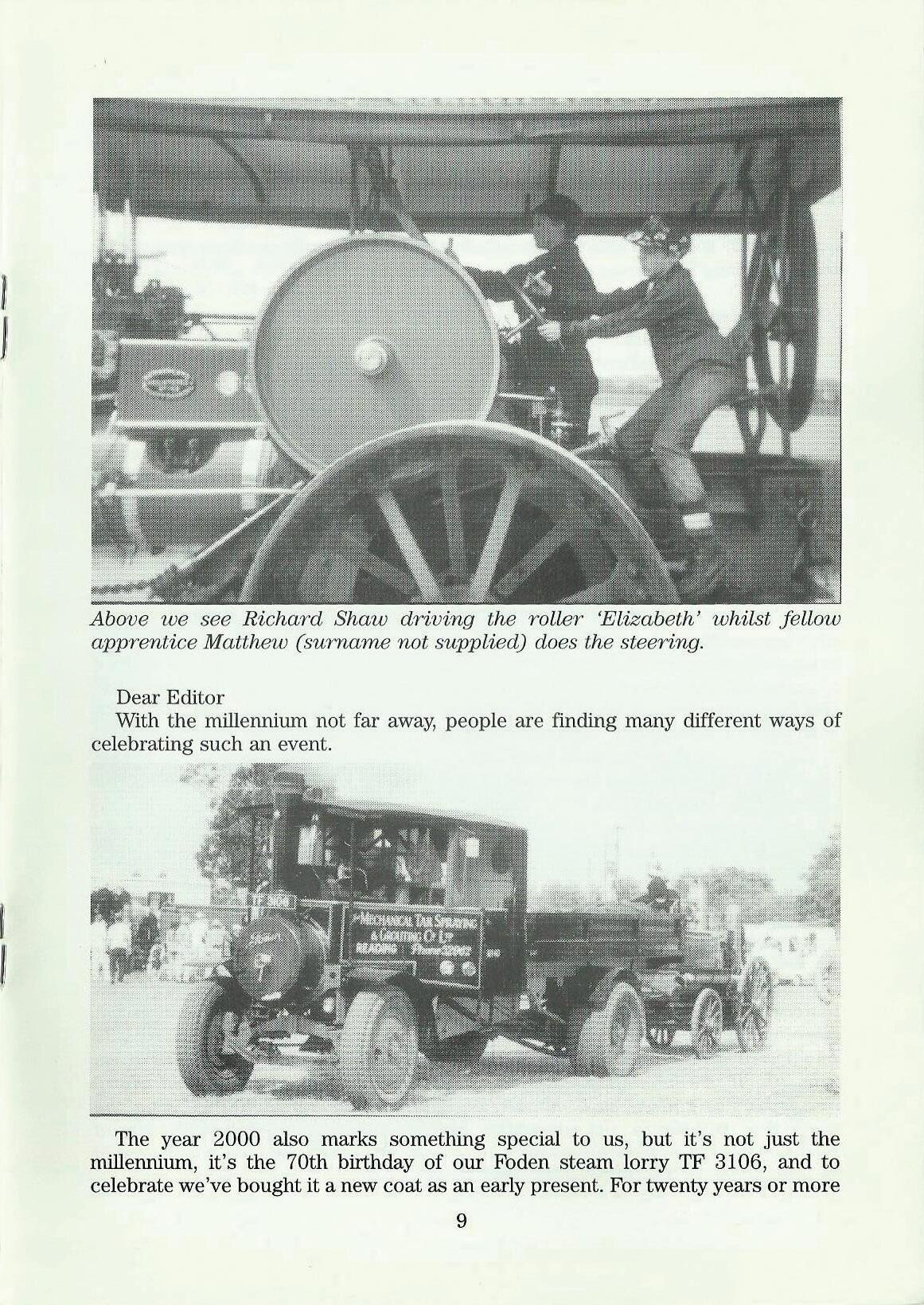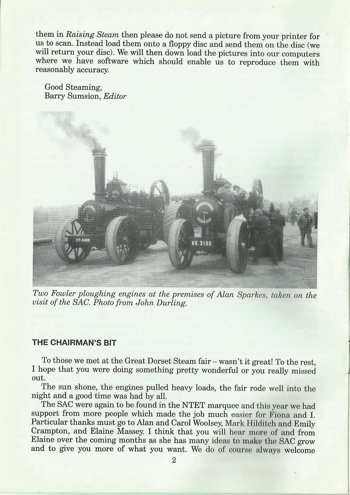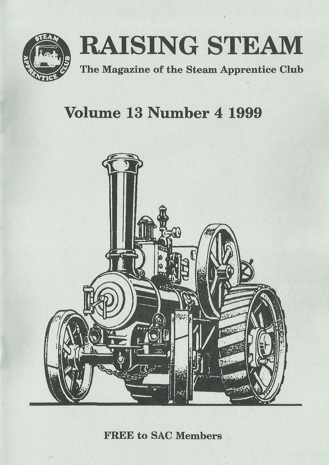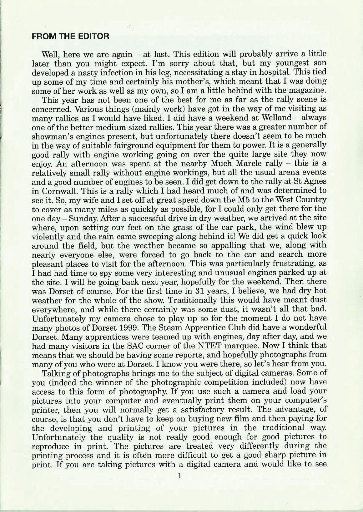 Well, here we are again -at last. This edition will probably arrive a little later than you might expect. I'm sorry about that, but my youngest son developed a nasty infection in his leg, necessitating a stay in hospital. This tied up some of my time and certainly his mother's, which meant that I was doing some of her work as well as my own, so I am a little behind with the magazine. This year has not been one of the best for me as far as the rally scene is concerned. Various things (mainly work) have got in the way of me visiting as many rallies as I would have liked. I did have a weekend at Welland -always one of the better medium sized rallies. This year there was a greater number of showman's engines present, but unfortunately there doesn't seem to be much in the way of suitable fairground equipment for them to power. It is a generally good rally with engine working going on over the quite large site they now enjoy. An afternoon was spent at the nearby Much Marcle rally -this is a relatively small rally without engine workings, but all the usual arena events and a good number of engines to be seen. I did get down to the rally at St Agnes in Cornwall. This is a rally which I had heard much of and was determined to see it. So, my wife and I set off at great speed down the M5 to the West Country to cover as many miles as quickly as possible, for I could only get there for the one day - Sunday. After a successful drive in dry weather, we arrived at the site where, upon setting our feet on the grass of the car park, the wind blew up violently and the rain came sweeping along behind it! We did get a quick look around the field, but the weather became so appalling that we, along with nearly everyone else, were forced to go back to the car and search more pleasant places to visit for the afternoon. This was particularly frustrating, as I had had time to spy some very interesting and unusual engines parked up at the site. I will be going back next year, hopefully for the weekend. Then there was Dorset of course. For the first time in 31 years, I believe, we had dry hot weather for the whole of the show. Traditionally this would have meant dust everywhere, and while there certainly was some dust, it wasn't all that bad. Unfortunately my camera chose to play up so for the moment I do not have many photos of Dorset 1999. The Steam Apprentice Club did have a wonderful Dorset. Many apprentices were teamed up with engines, day after day, and w,e had many visitors in the SAC corner of the NTET marquee. Now I think that means that we should be having some reports, and hopefully photographs from many of you who were at Dorset. I know you were there, so let's hear from you. Talking of photographs brings me to the subject of digital cameras. Some of you (indeed the winner of the photographic competition included) now have access to this form of photography. If you use such a camera and load your pictures into your computer and eventually print them on your computer's printer, then you will normally get a satisfactory result. The advantage, of course, is that you don't have to keep on buying new film and then paying for the developing and printing of your pictures in the traditional way. Unfortunately the quality is not really good enough for good pictures to reproduce in print. The pictures are treated very differently during the printing process and it is often more difficult to get a good sharp picture in print. If you are taking pictures with a digital camera and would like to see