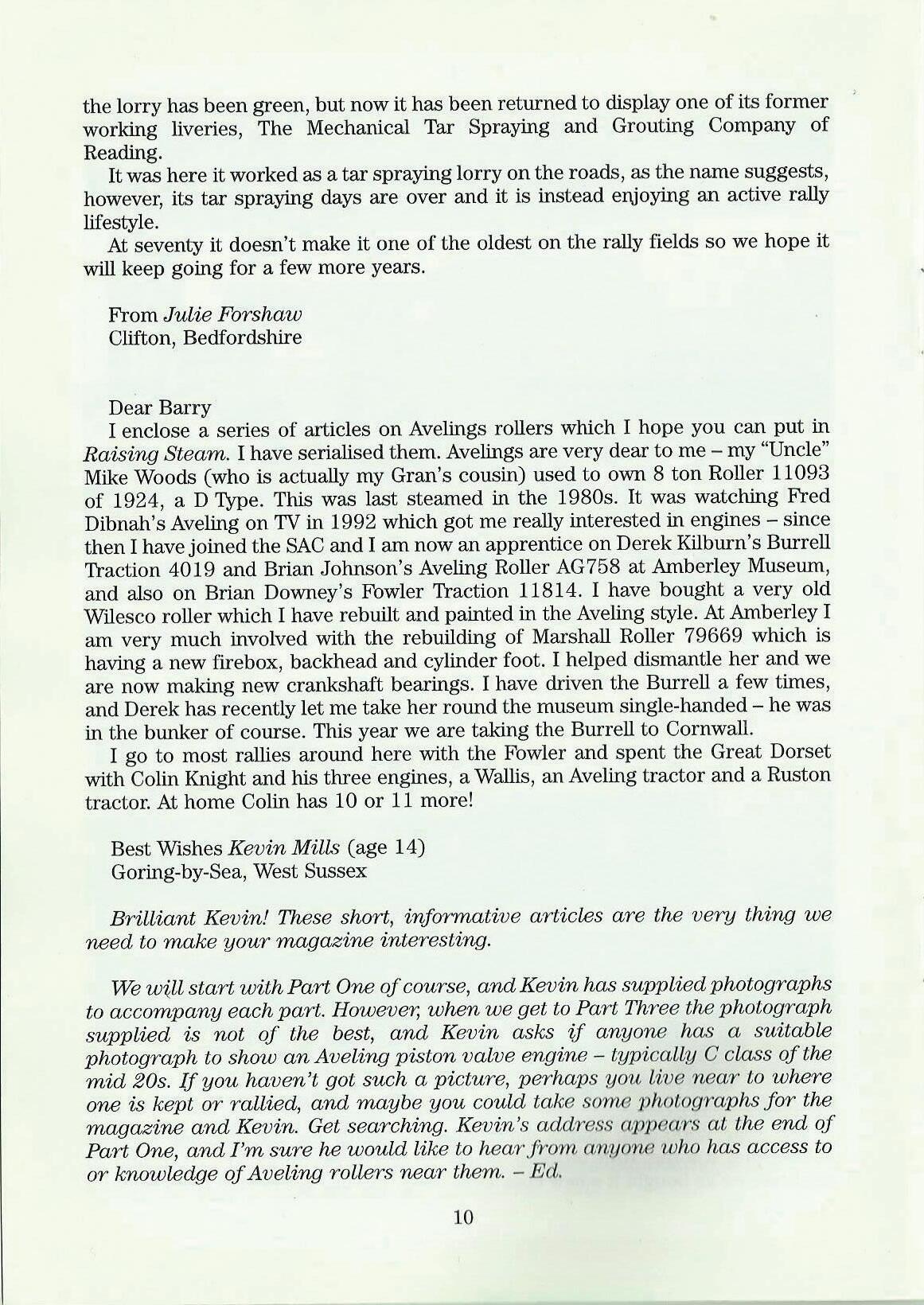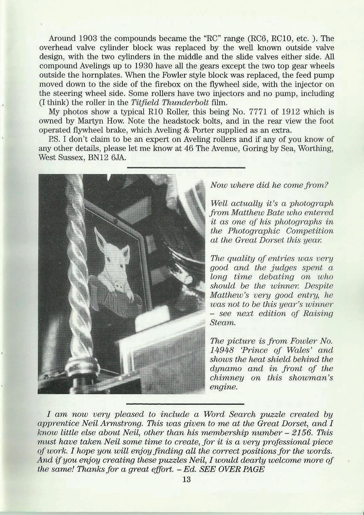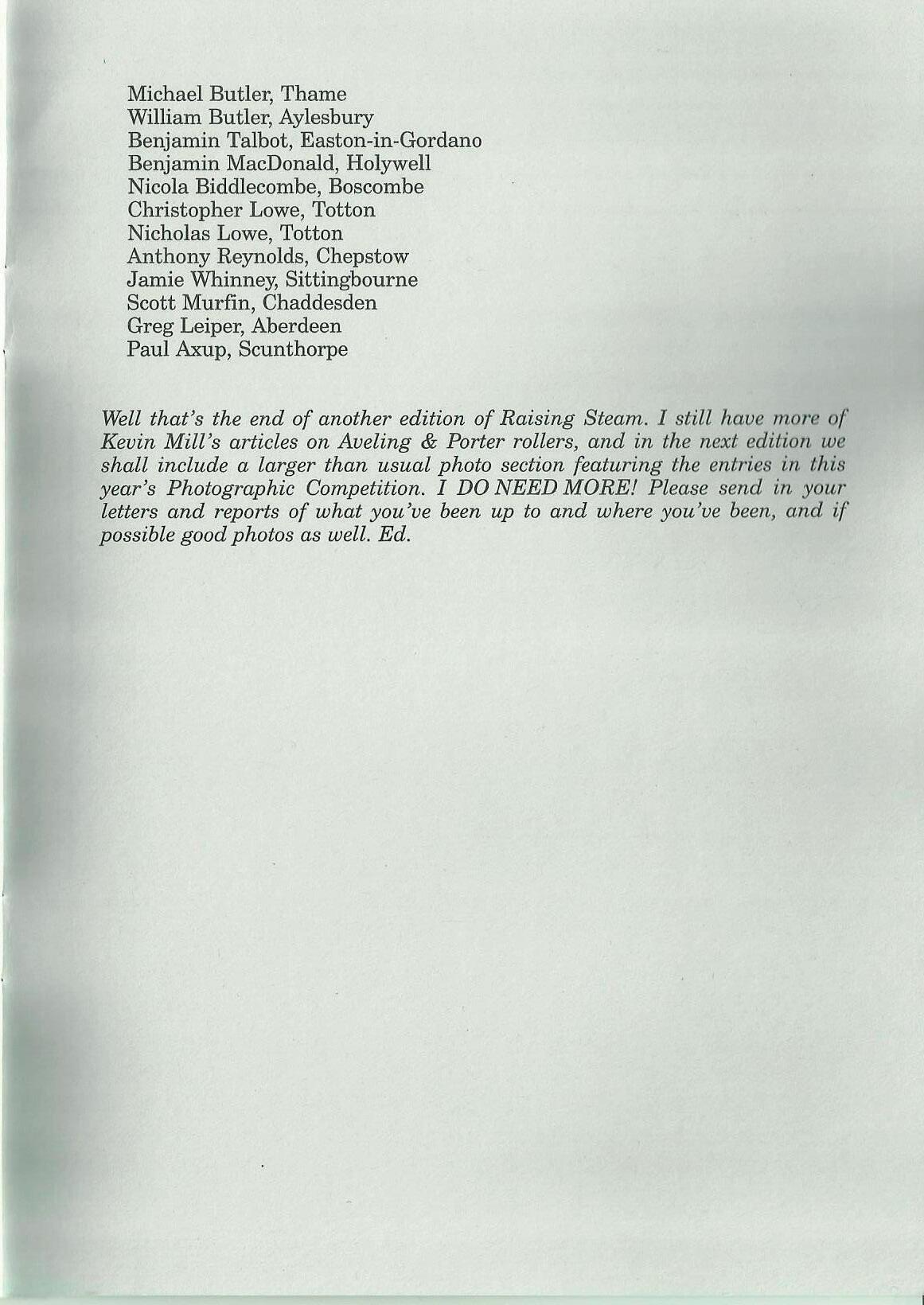 Well that's the end of another edition of Raising Steam. I still have more o/" Kevin Mill's articles on Aveling & Porter rollers, and in the next edition we shall include a larger than usual photo section featuring the entries in this year's Photographic Competition. I DO NEED MORE! Please send in your letters and reports of what you've been up to and where you've been, and if possible good photos as well. Ed.