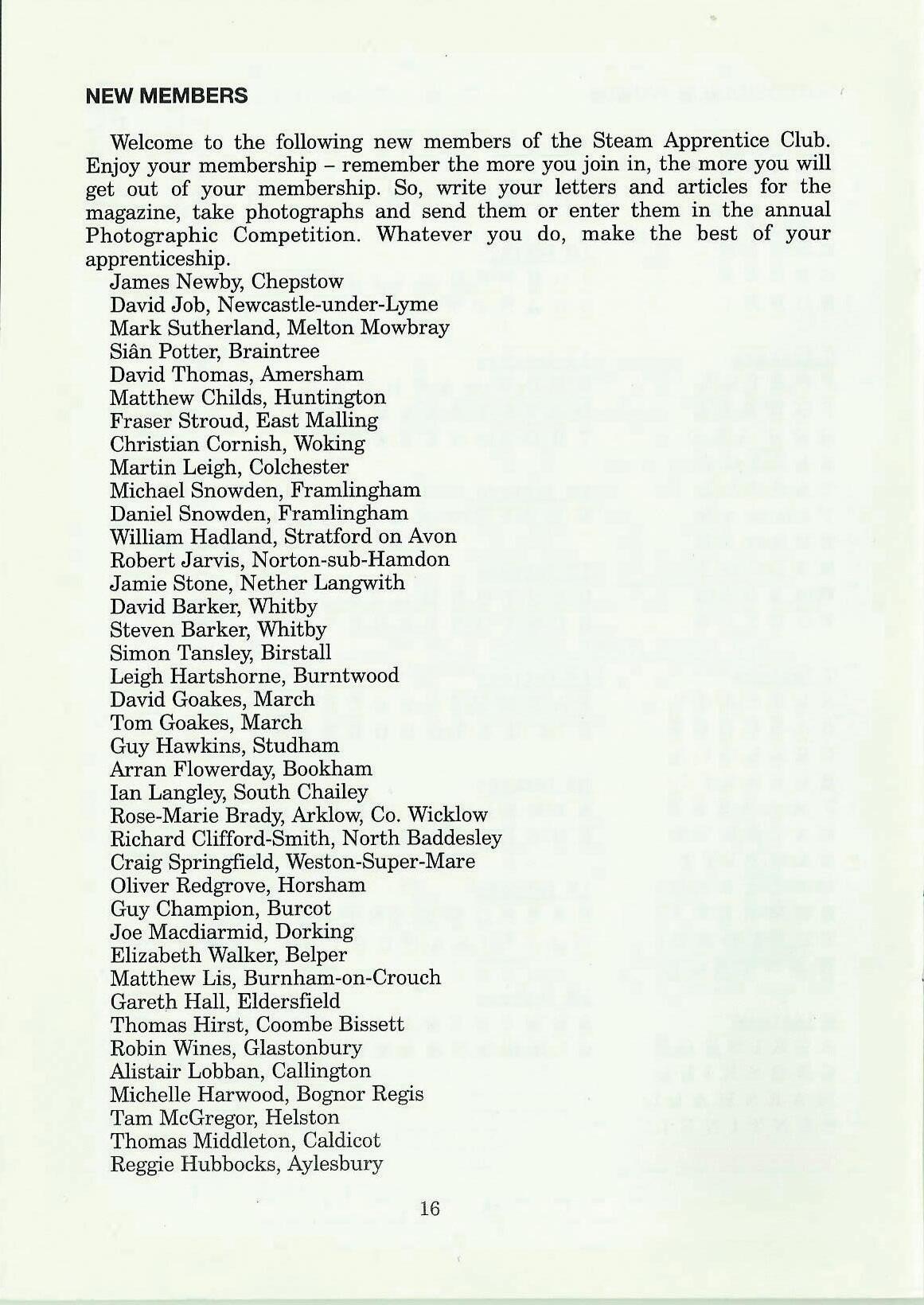 Welcome to the following new members of the Steam Apprentice Club. Enjoy your membership - remember the more you join in, the more you will get out of your membership. So, write your letters and articles for the magazine, take photographs and send them or enter them in the annual Photographic Competition. Whatever you do, make the best of your apprenticeship.