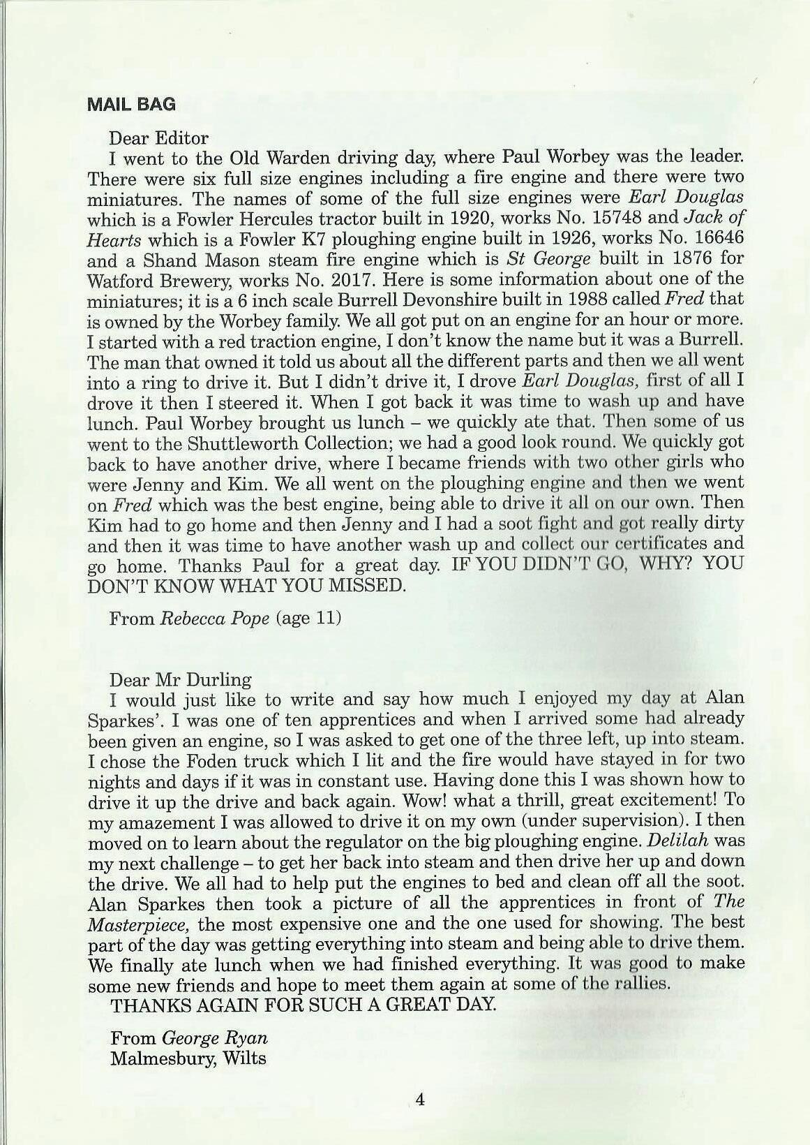 I went to the Old Warden driving day, where Paul Worbey was the leader. There were six full size engines including a fire engine and there were two miniatures. The names of some of the full size engines were Earl Douglas which is a Fowler Hercules tractor built in 1920, works No. 15748 and Jack of Hearts which is a Fowler K7 ploughing engine built in 1926, works No. 16646 and a Shand Mason steam fire engine which is St George built in 1876 for Watford Brewery, works No. 2017. Here is some information about one of the miniatures; it is a 6 inch scale Burrell Devonshire built in 1988 called Fred that is owned by the Worbey family. We all got put on an engine for an hour or more. I started with a red traction engine, I don't know the name but it was a Burrell. The man that owned it told us about all the different parts and then we all went into a ring to drive it. But I didn't drive it, I drove Earl Douglas, first of all I drove it then I steered it. When I got back it was time to wash up and have lunch. Paul Worbey brought us lunch - we quickly ate that. Then some of us went to the Shuttleworth Collection; we had a good look round. We quickly got back to have another drive, where I became friends with two other girls who were Jenny and Kim. We all went on the ploughing engine and then we went on Fred which was the best engine, being able to drive it all on our own. Then Kim had to go home and then Jenny and I had a soot fight and got really dirty and then it was time to have another wash up and collect our certificates and go home. Thanks Paul for a great day. IF YOU DIDN'T GO, WHY? YOU DON'T KNOW WHAT YOU MISSED.