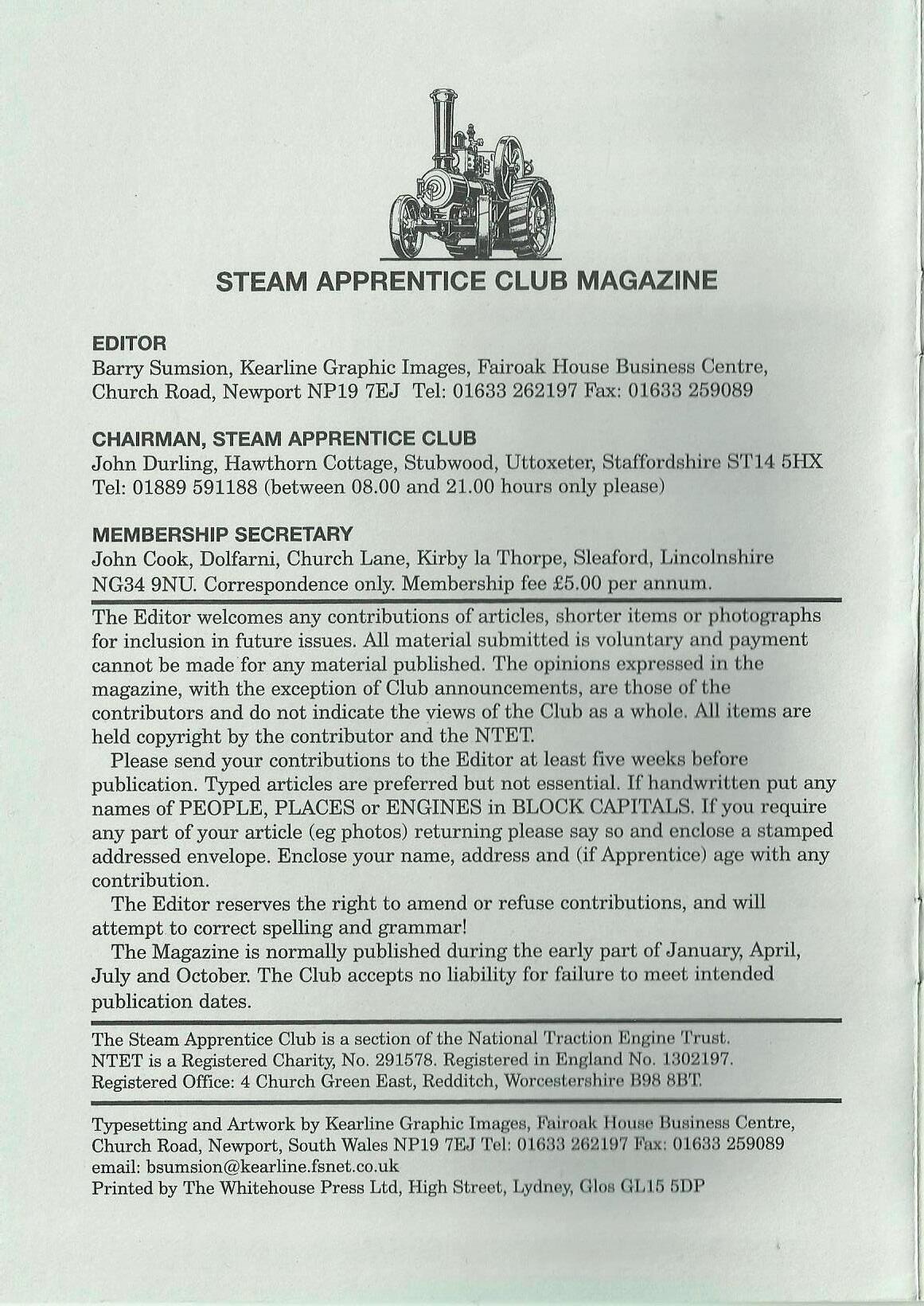 The Steam Apprentice Club is a section of the National Traction Engine Trust. NTET is a Registered Charity, No. 291578. Registered in England No. 1:102197. Registered Office: 4 Church Green East, Redd.itch, WorceR'LerHhirnA98 8B'I~