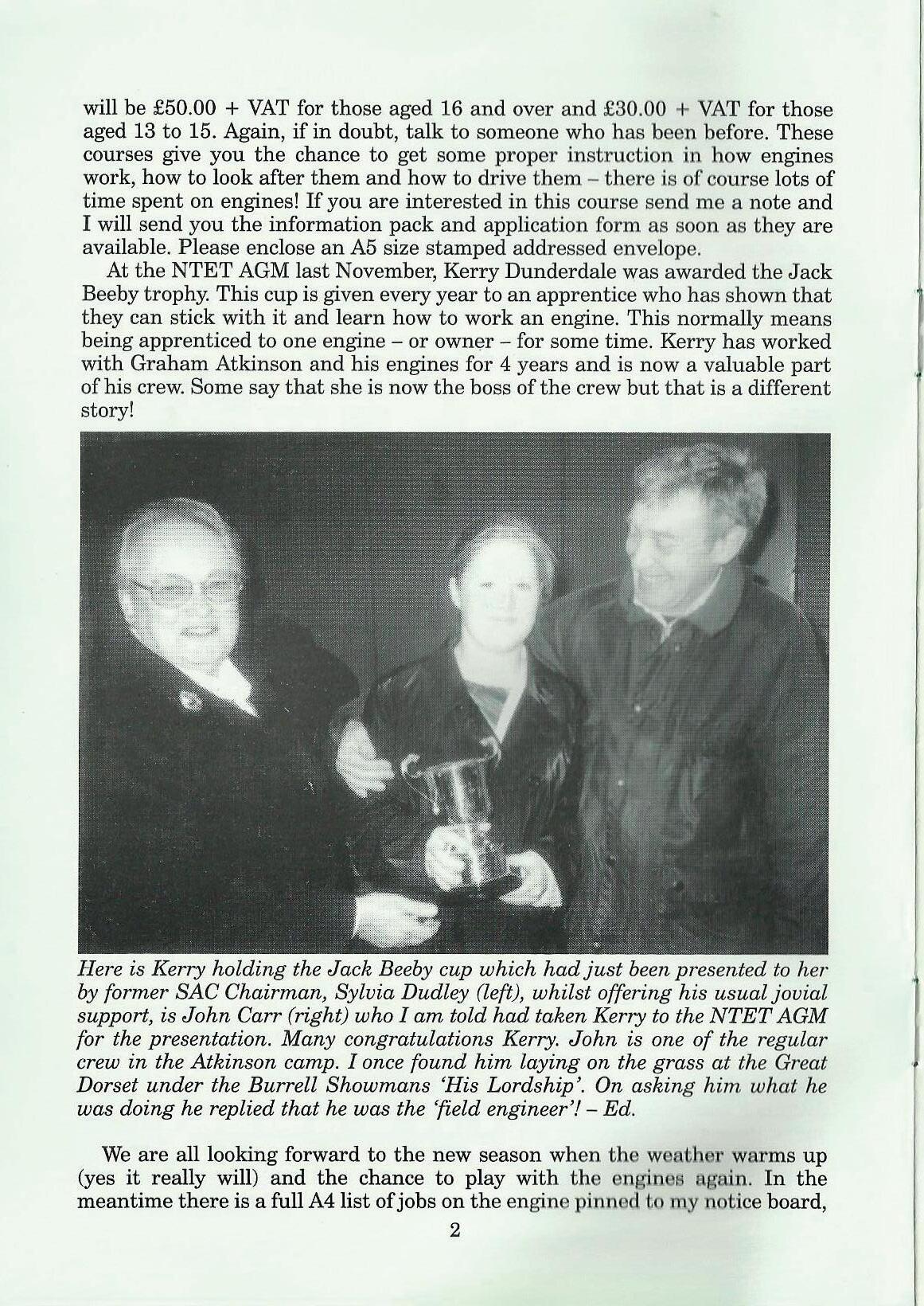 At the NTET AGM last November, Kerry Dunderdale was awarded the Jack Beeby trophy. This cup is given every year to an apprentice who has shown that they can stick with it and learn how to work an engine. This normally means being apprenticed to one engine - or owner - for some time. Kerry has worked with Graham Atkinson and his engines for 4 years and is now a valuable part of his crew. Some say that she is now the boss of the crew but that is a different story!