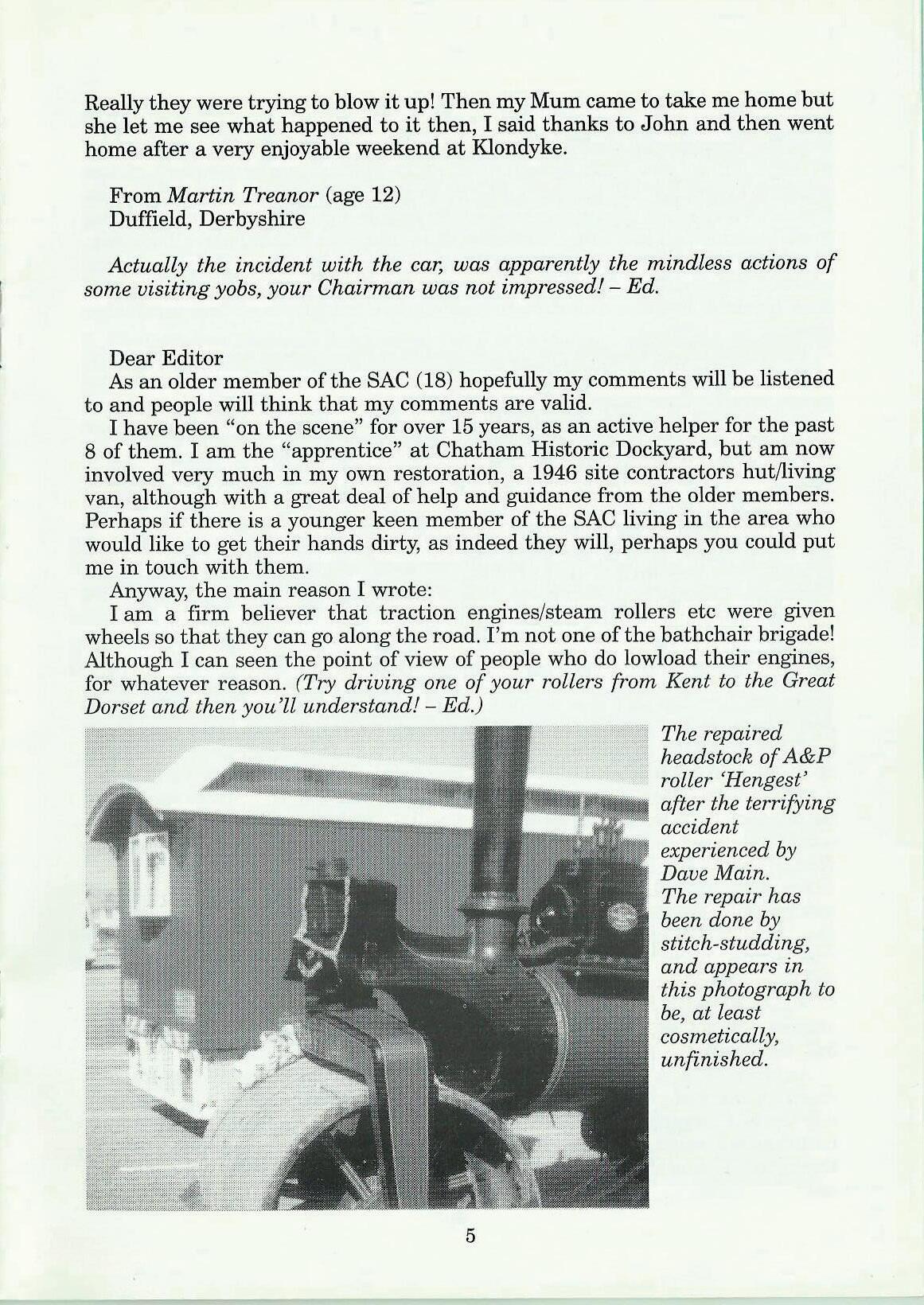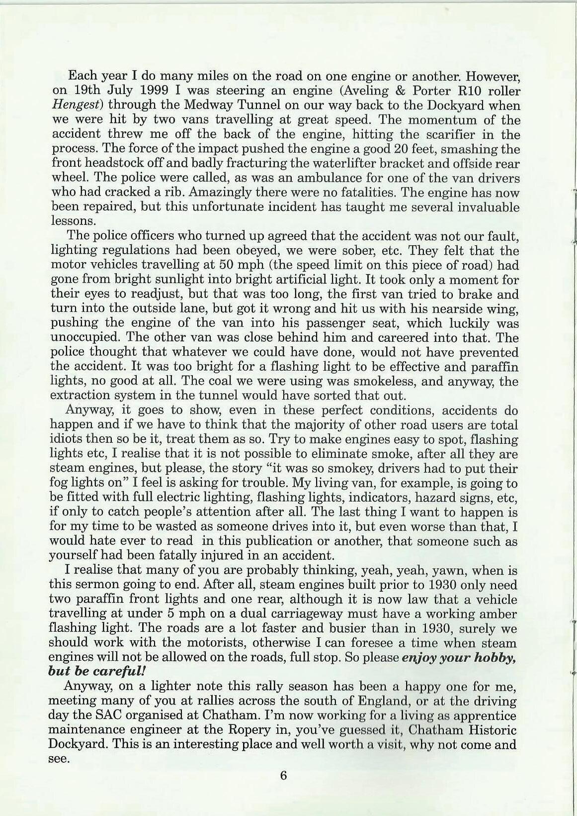 Each year I do many miles on the road on one engine or another. However, on 19th July 1999 I was steering an engine (Aveling & Porter Rl0 roller Hengest) through the Medway Tunnel on our way back to the Dockyard when we were hit by two vans travelling at great speed. The momentum of the accident threw me off the back of the engine, hitting the scarifier in the process. The force of the impact pushed the engine a good 20 feet, smashing the front headstock off and badly fracturing the water lifter bracket and offside rear wheel. The police were called, as was an ambulance for one of the van drivers who had cracked a rib. Amazingly there were no fatalities. The engine has now j been repaired, but this unfortunate incident has taught me several invaluable lessons.