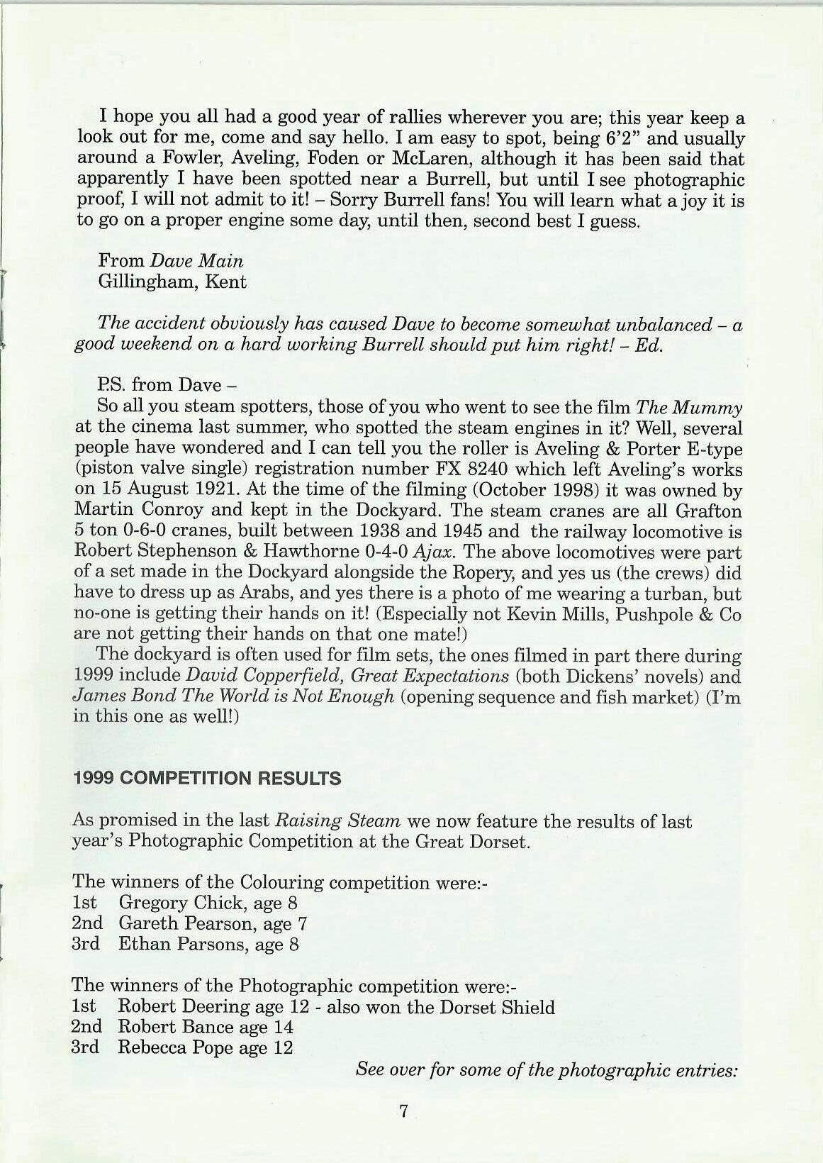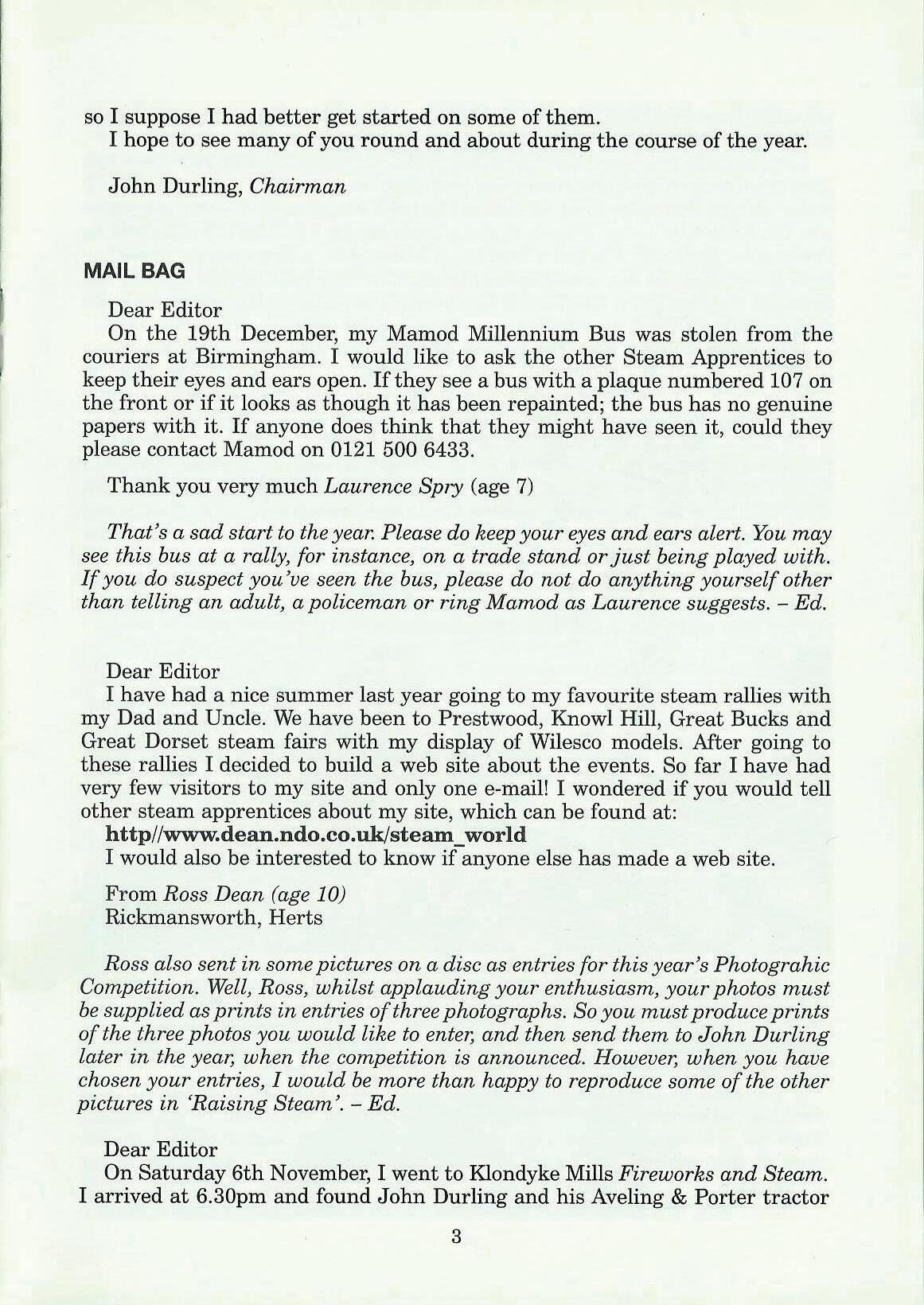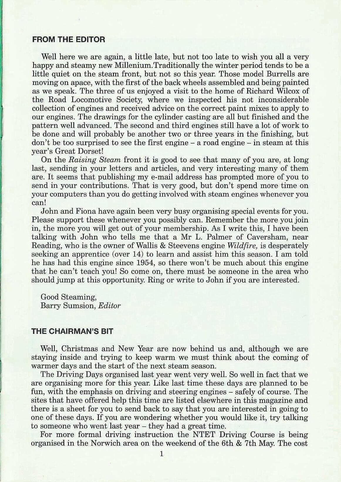 On the Raising Steam front it is good to see that many of you are, at long last, sending in your letters and articles, and very interesting many of them are. It seems that publishing my e-mail address has prompted more of you to send in your contributions. That is very good, but don't spend more time on your computers than you do getting involved with steam engines whenever you can!