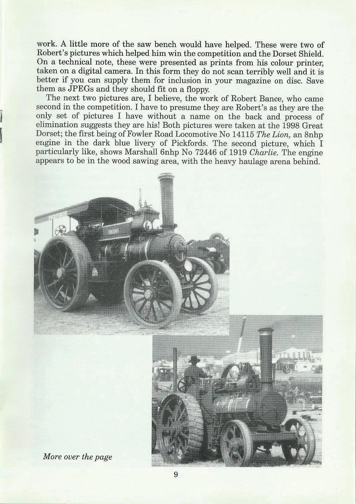 The next two pictures are, I believe, the work of Robert Bance, who came second in the competition. I have to presume they are Robert's as they are the only set of pictures I have without a name on the back and process of elimination suggests they are his! Both pictures were taken at the 1998 Great Dorset; the first being of Fowler Road Locomotive No 14115 The Lion, an 8nhp engine in the dark blue livery of Pickfords. The second picture, which I particularly like, shows Marshall 6nhp No 72446 of 1919 Charlie. The engine appears to be in the wood sawing area, with the heavy haulage arena behind.