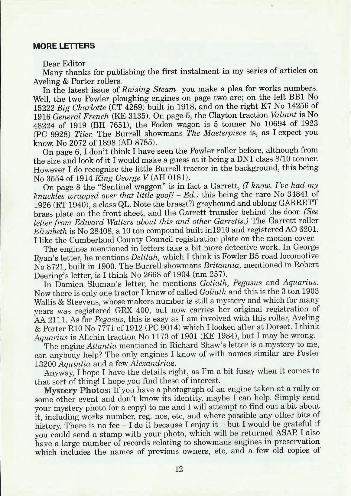 In the latest issue of Raising Steam you make a plea for works numbers. Well, the two Fowler ploughing engines on page two are; on the left BBl No 15222 Big Charlotte (CT 4289) built in 1918, and on the right K7 No 14256 of 1916 General French (KE 3135). On page 5, the Clayton traction Valiant is No 48224 of 1919 (BH 7651), the Foden wagon is 5 tonner No 10694 of 1923 (PC 9928) Tiler. The Burrell showmans The Masterpiece is, as I expect you know, No 2072 of 1898 (AD 8785).