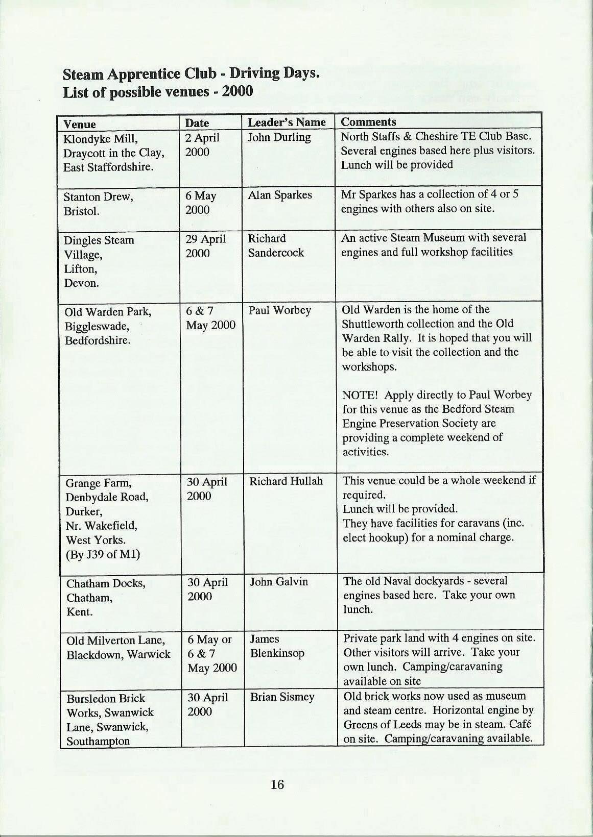 The Driving Days organised last year went very well. So well in fact that we are organising more for this year. Like last time these days are planned to be fun, with the emphasis on driving and steering engines -safely of course. The sites that have offered help this time are listed elsewhere in this magazine and there is a sheet for you to send back to say that you are interested in going to one of these days. If you are wondering whether you would like it, try talking to someone who went last year - they had a great time.