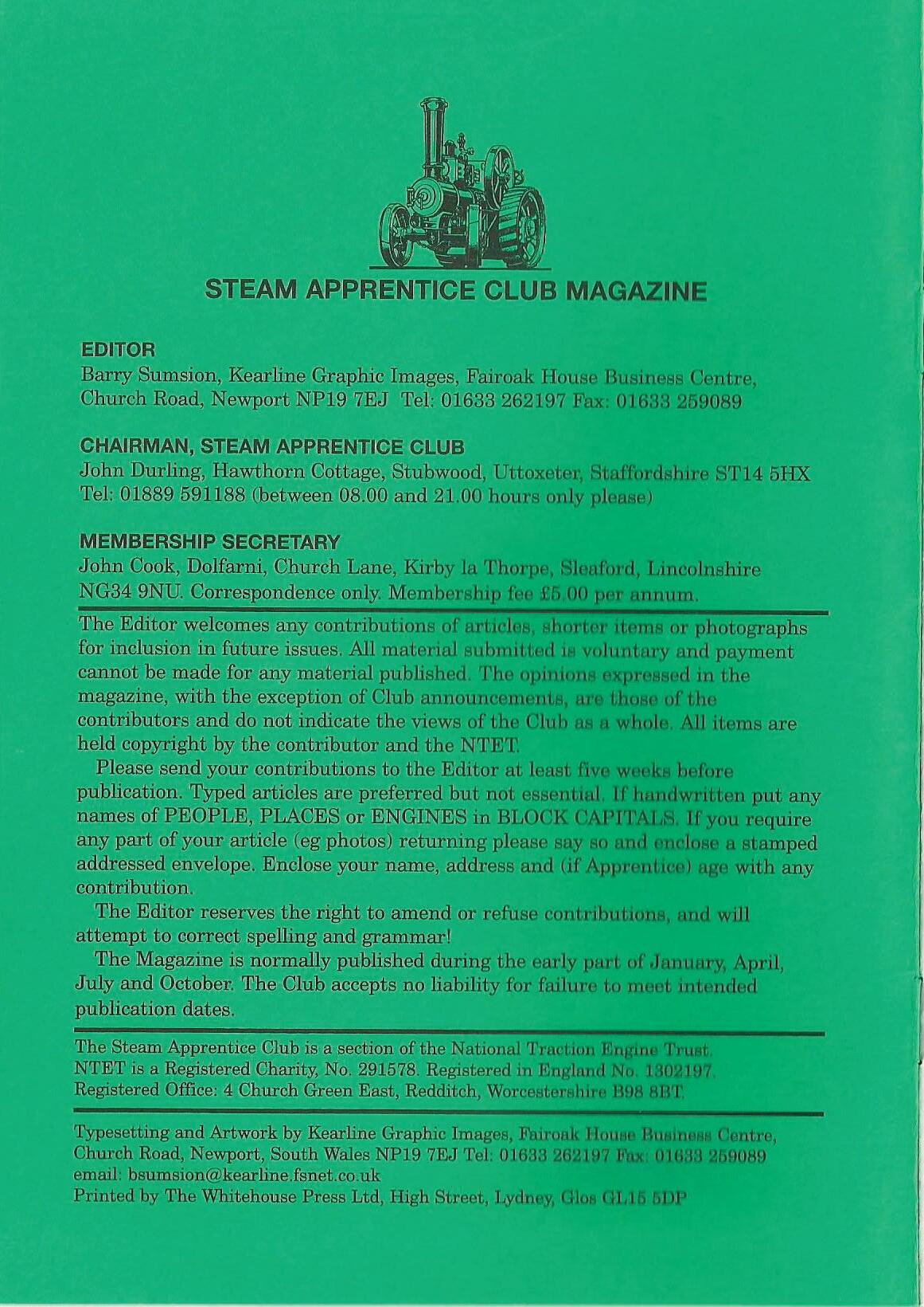 John and Fiona have again been very busy organising special events for you. Please support these whenever you possibly can. Remember the more you join in, the more you will get out of your membership. As I write this, I have been talking with John who tells me that a Mr L. Palmer of Caversham, near Reading, who is the owner of Wallis & Steevens engine Wildfire, is desperately seeking an apprentice (over 14) to learn and assist him this season. I am told he has had this engine since 1954, so there won't be much about this engine that he can't teach you! So come on, there must be someone in the area who should jump at this opportunity. Ring or write to John if you are interested.