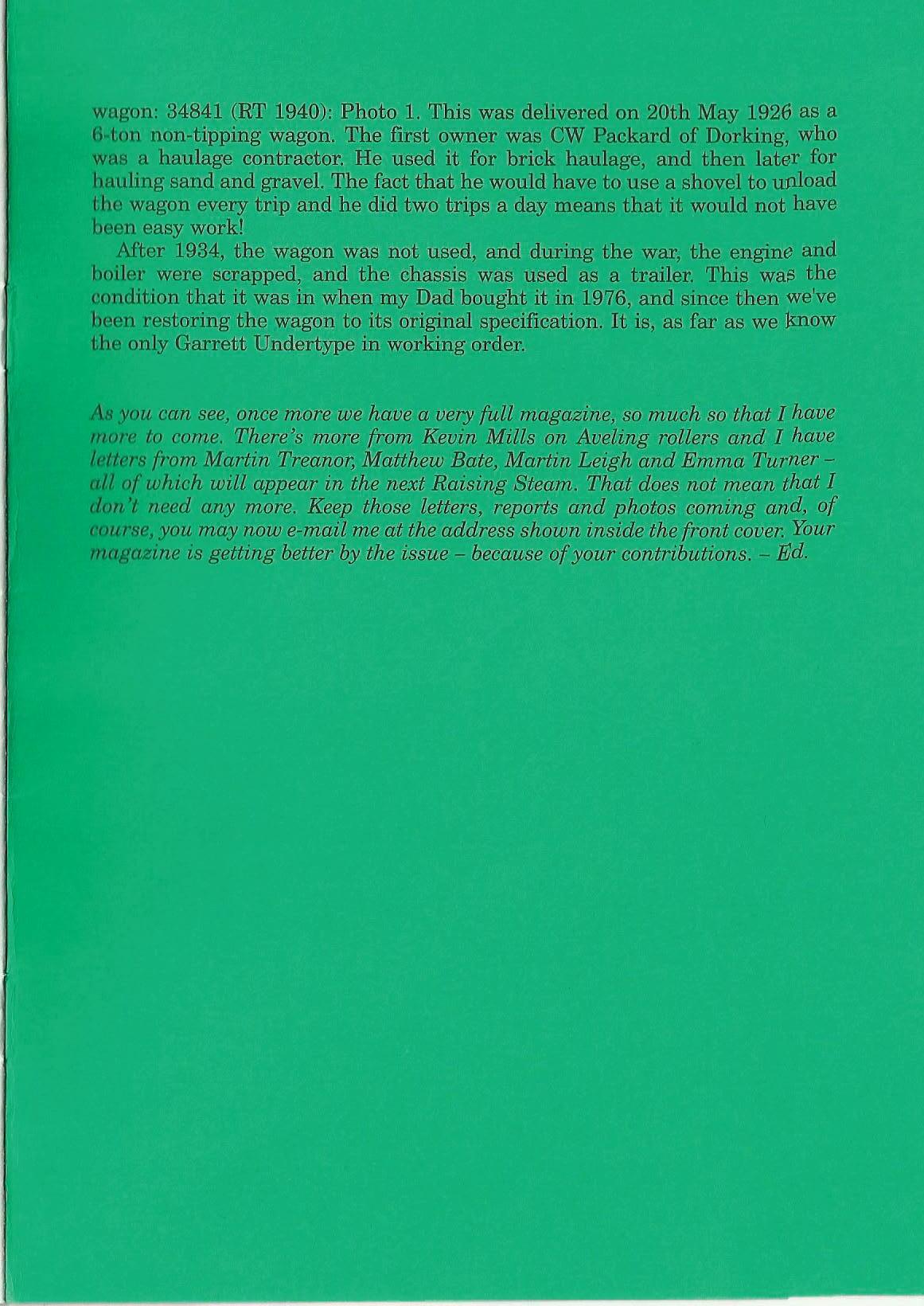 Because of the amount of correspondence and held over matter printed this time, it has not been possible to produce Part 2 of Kevin 's articles on Aveling rollers. They will appear from the next issue. Kevin will be pleased to hear that I have received two photos of a C class roller from Dr Barry Job, which hopefully we shall use at the appropriate time. They are then to be sent on to Kevin. I hope you all appreciate Kevin's offer. It is good to hear from an apprentice who is obviously so keen.
