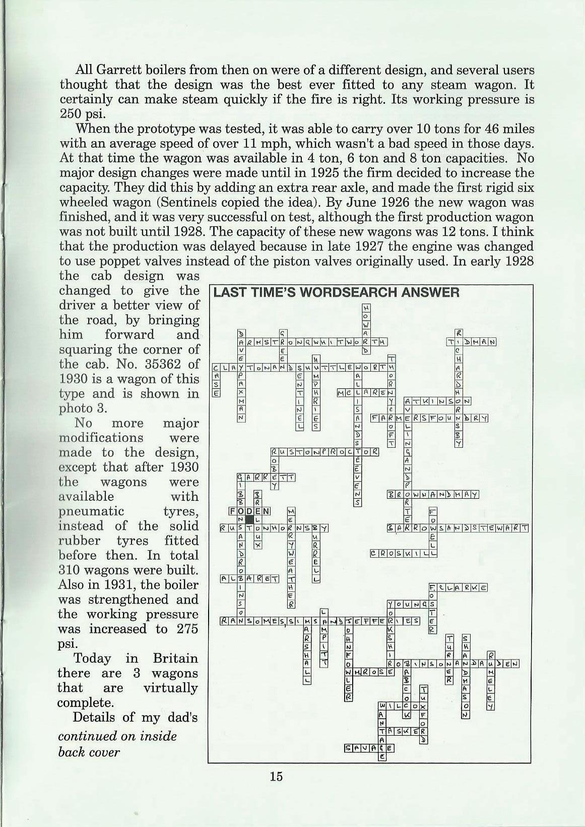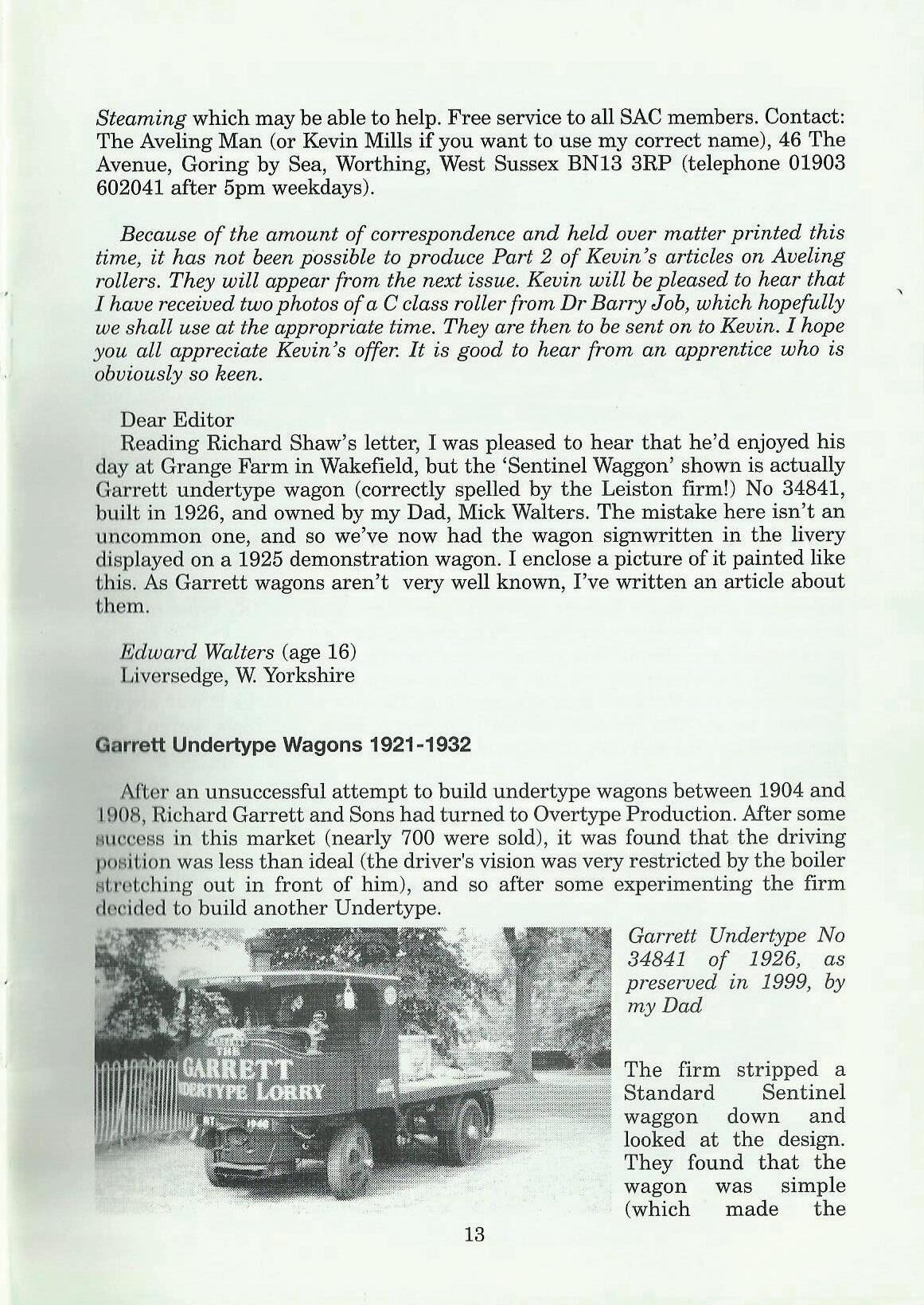 Reading Richard Shaw's letter, I was pleased to hear that he'd enjoyed his day at Grange Farm in Wakefield, but the 'Sentinel Waggon' shown is actually Garrett undertype wagon (correctly spelled by the Leiston firm!) No 34841, built in 1926, and owned by my Dad, Mick Walters. The mistake here isn't an uncommon one, and so we've now had the wagon signwritten in the livery displayed on a 1925 demonstration wagon. I enclose a picture of it painted like this. As Garrett wagons aren't very well known, I've written an article about them.