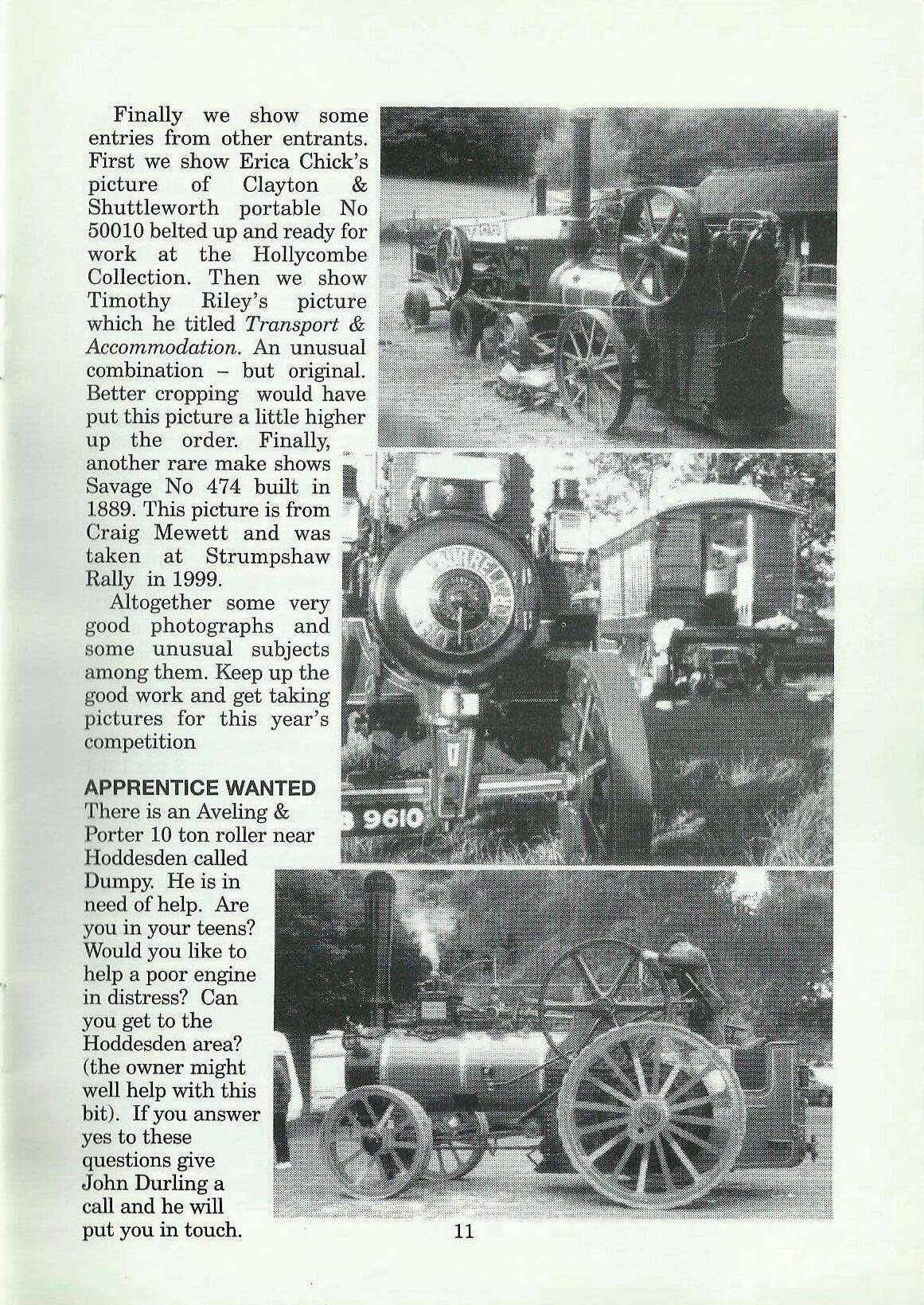 Finally we show some entries from other entrants. First we show Erica Chick's picture of Clayton & Shuttleworth portable No 50010 belted up and ready for work at the Hollycombe Collection. Then we show Timothy Riley's picture which he titled Transport & Accommodation. An unusual combination -but original. Better cropping would have put this picture a little higher up the order. Finally, another rare make shows Savage No 4 74 built in 1889. This picture is from Craig Mewett and was taken at Strumpshaw Rally in 1999. Altogether some very good photographs and some unusual subjects among them. Keep up the good work and get taking pictures for this year's competition