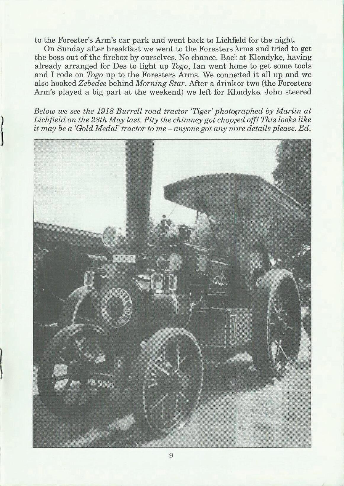 Below we see the 1918 Burrell road tractor 'Tiger' photographed by Martin at Lichfield on the 28th May last. Pity the chimney got chopped off! This looks like it may be a 'Gold Medal' tractor to me - anyone got any more details please. Ed.
