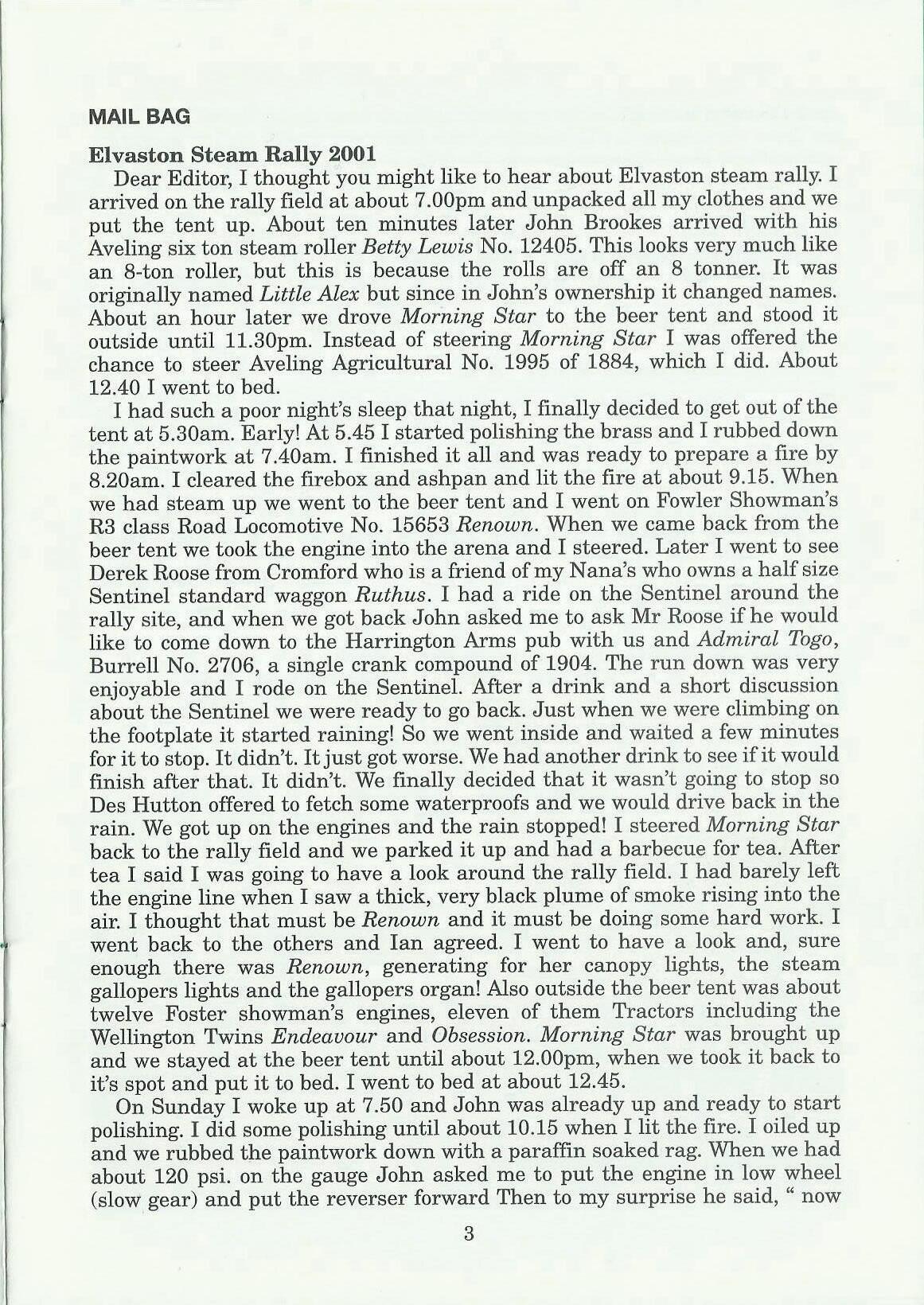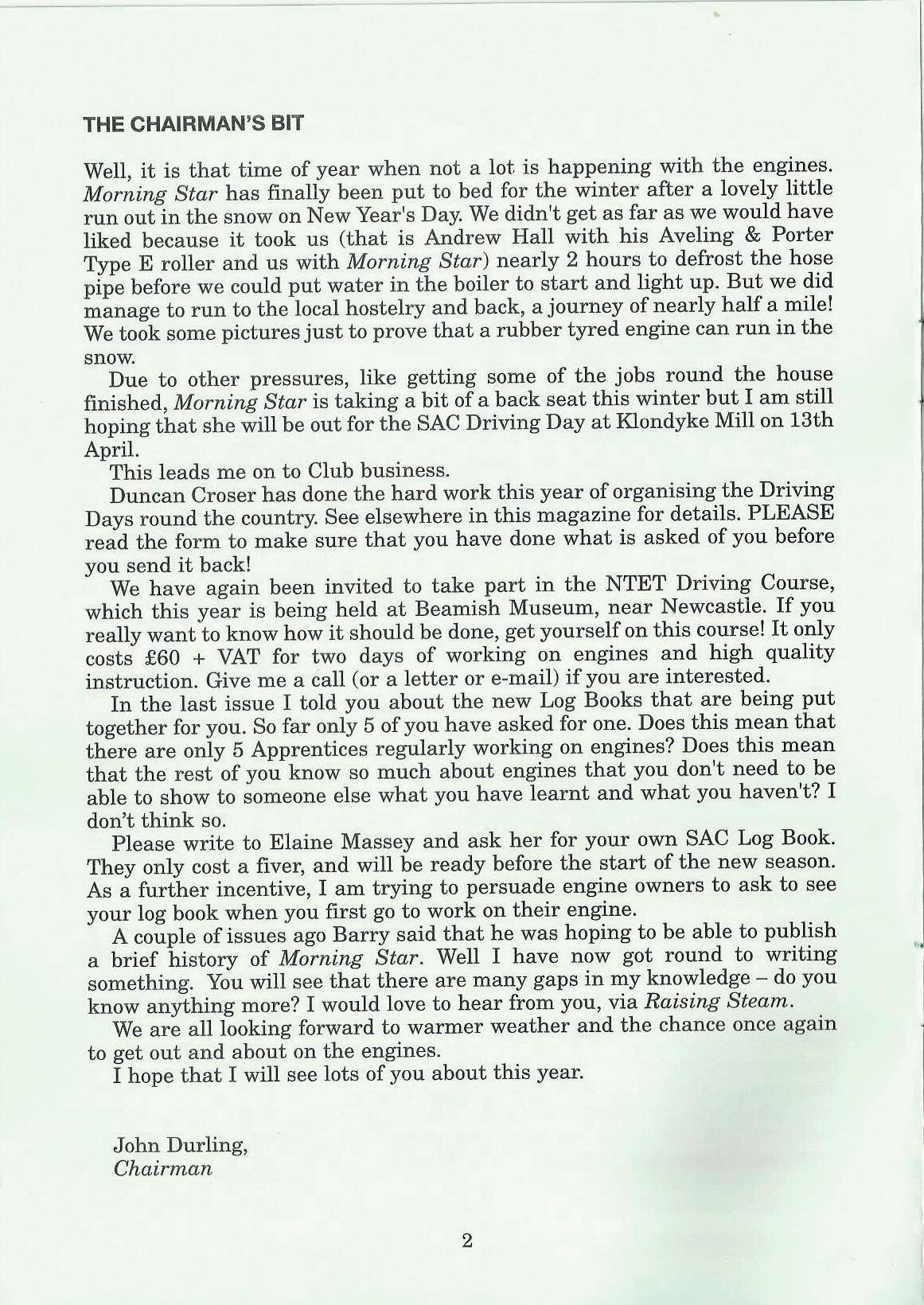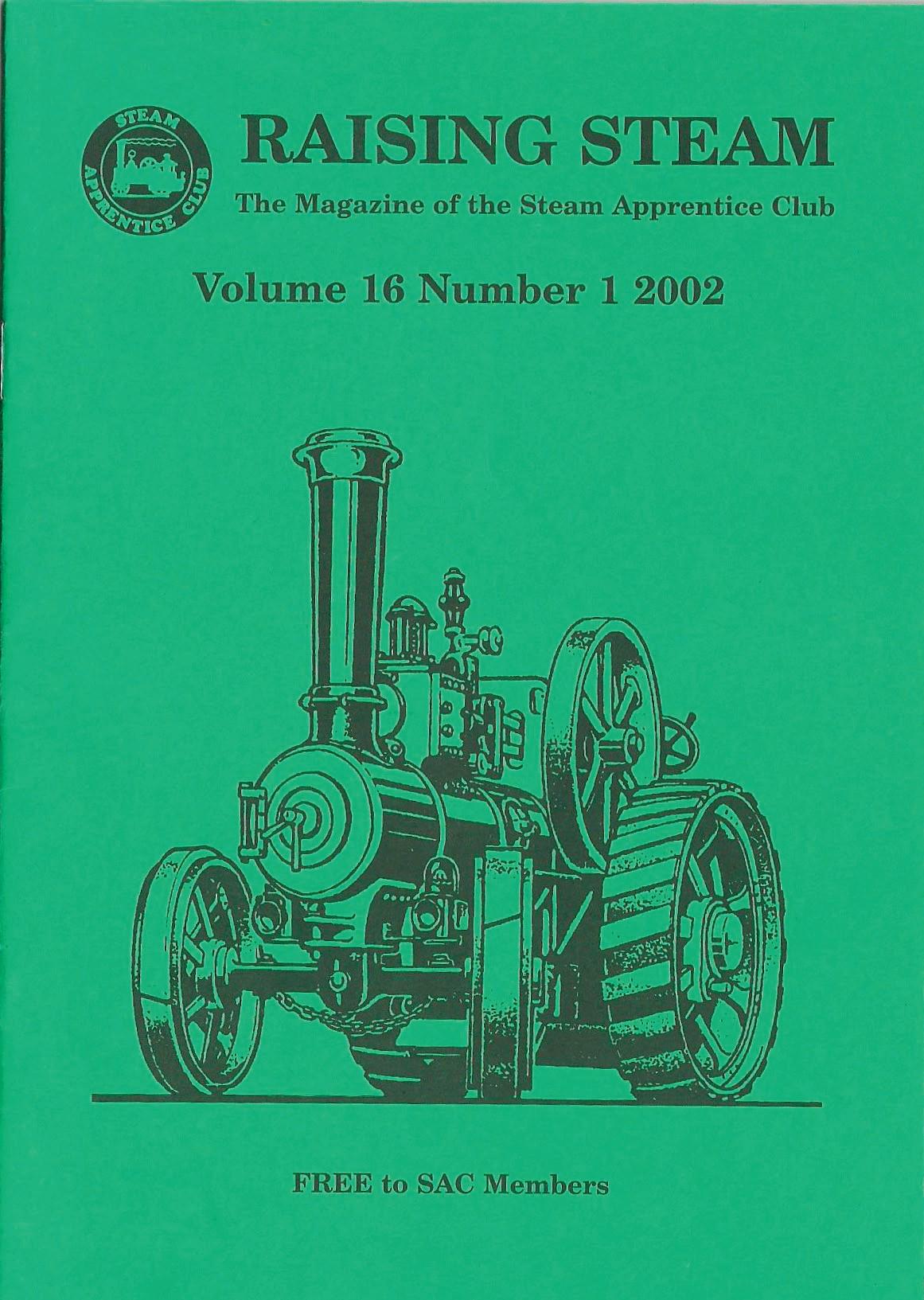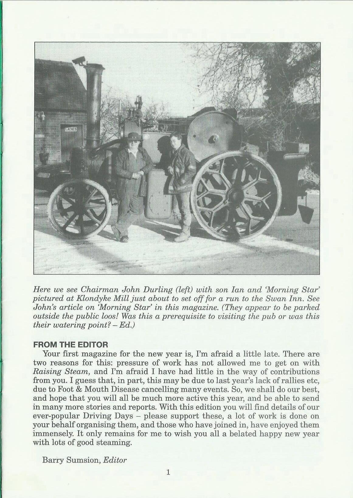 Your first magazine for the new year is, I'm afraid a little late. There are two reasons for this: pressure of work has not allowed me to get on with Raising Steam, and I'm afraid I have had little in the way of contributions from you. I guess that, in part, this may be due to last year's lack of rallies etc, due to Foot & Mouth Disease cancelling many events. So, we shall do our best, and hope that you will all be much more active this year, and be able to send in many more stories and reports. With this edition you will find details of our ever-popular Driving Days -please support these, a lot of work is done on your behalf organising them, and those who have joined in, have enjoyed them immensely. It only remains for me to wish you all a belated happy new year with lots of good steaming.