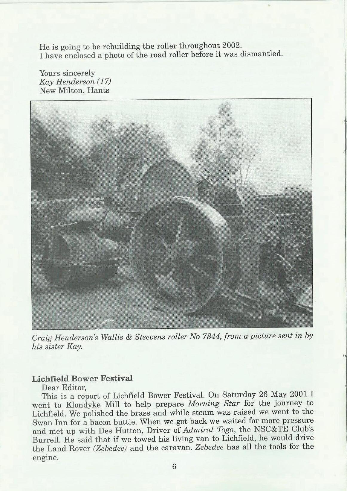 This is a report of Lichfield Bower Festival. On Saturday 26 May 2001 I went to Klondyke Mill to help prepare Morning Star for the journey to Lichfield. We polished the brass and while steam was raised we went to the Swan Inn for a bacon buttie. When we got back we waited for more pressure and met up with Des Hutton, Driver of Admiral Togo, the NSC&TE Club's Burrell. He said that if we towed his living van to Lichfield, he would drive the Land Rover (Zebedee) and the caravan. Zebedee has all the tools for the engine.