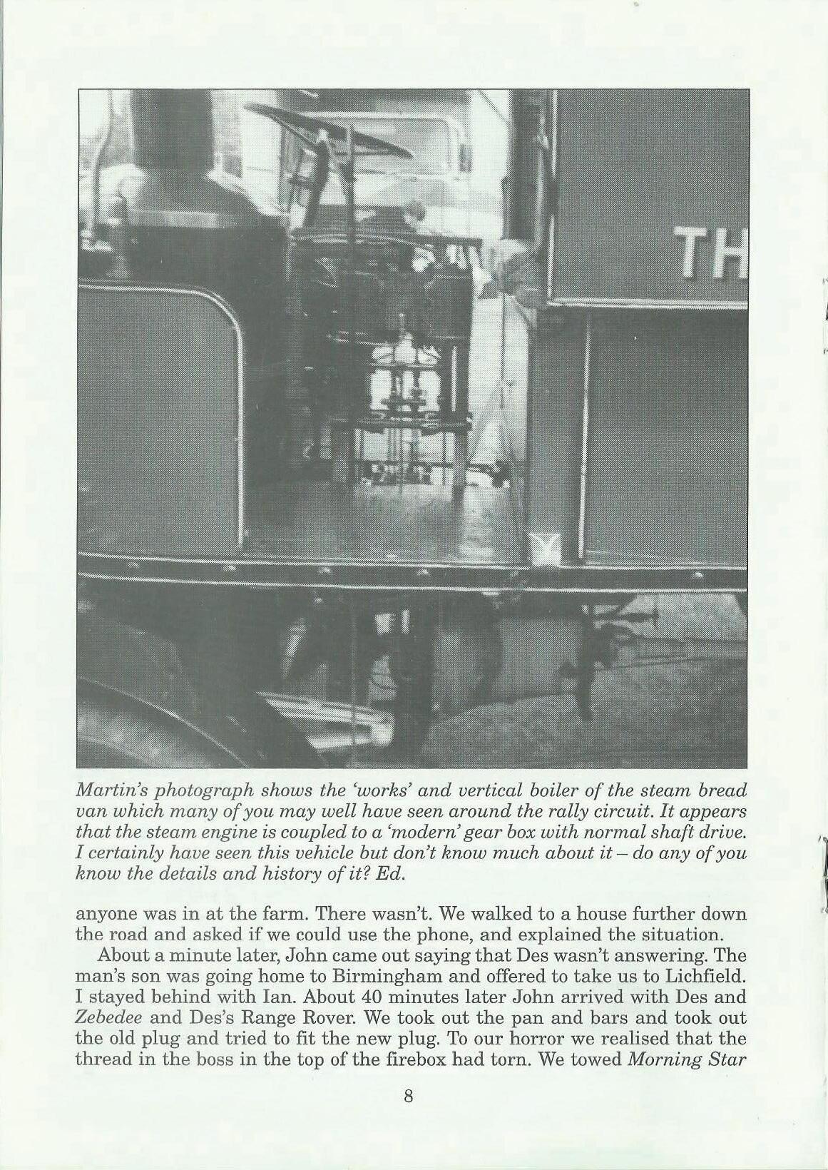 Martin's photograph shows the 'works' and vertical boiler of the steam bread van which many of you may well have seen around the rally circuit. It appears that the steam engine is coupled to a 'modern' gear box with normal shaft drive. I certainly have seen this vehicle but don't know m,uch about it - do any of you know the details and history of it? Ed.
