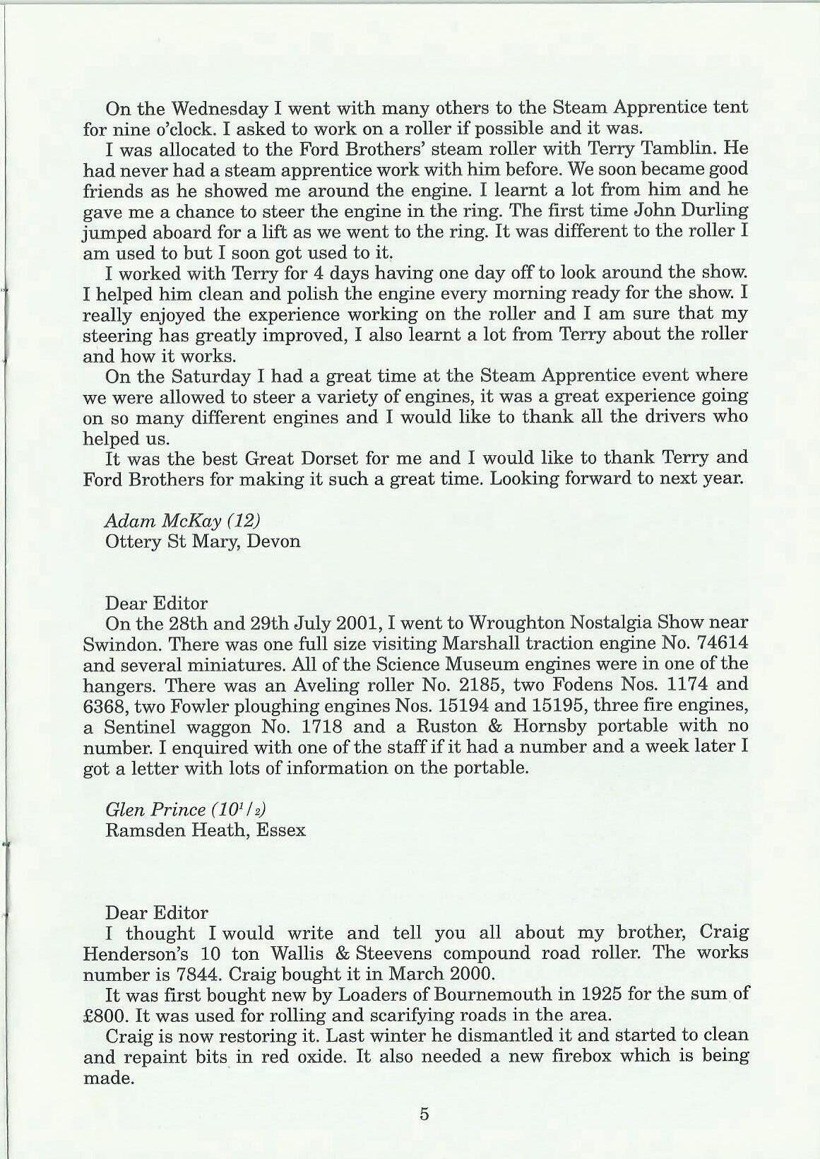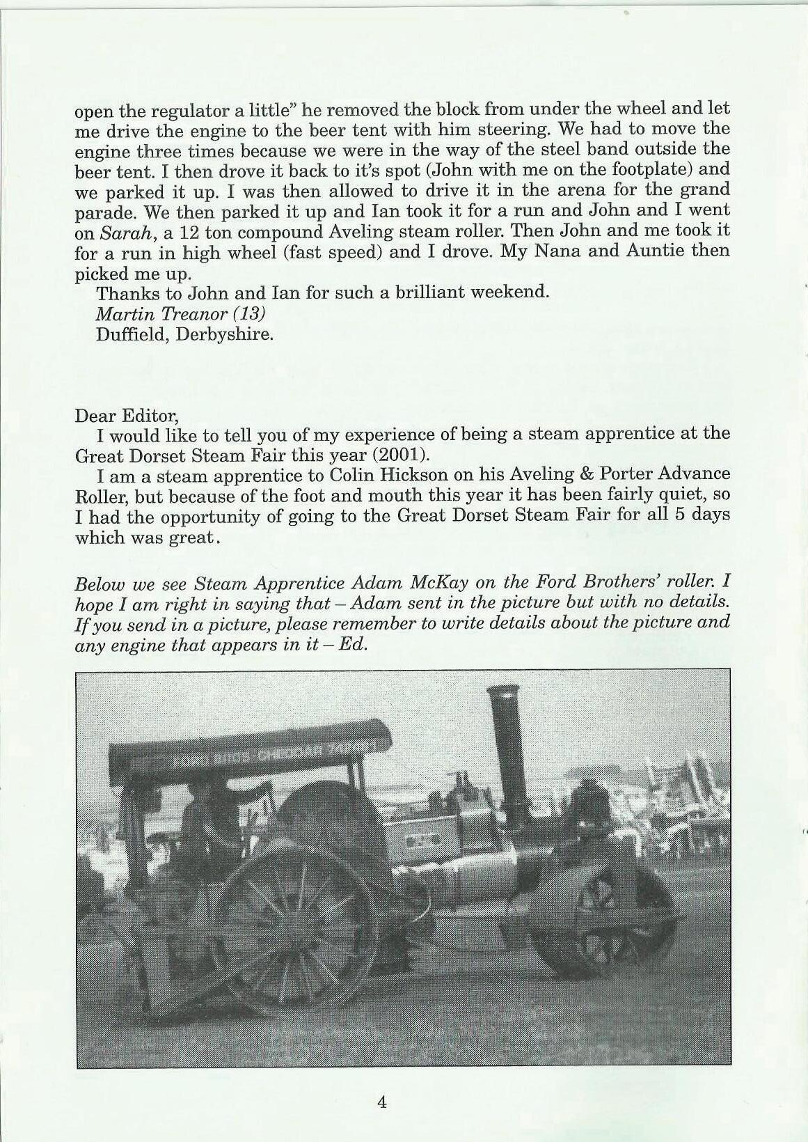 I would like to tell you of my experience of being a steam apprentice at the Great Dorset Steam Fair this year (2001).