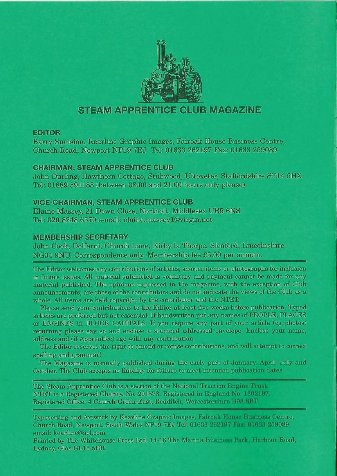 The Stearn Appr.entice Club li.sa section of the National Ti·action Engine rrrust, NTET is a Registered Char.ity, No. 291578. Registered in England No, 13021H7. Registered Office: 4 Chw:ch Gre-eR!Eas't,Reddii.tch,WorcestershU'e B98 8BT.