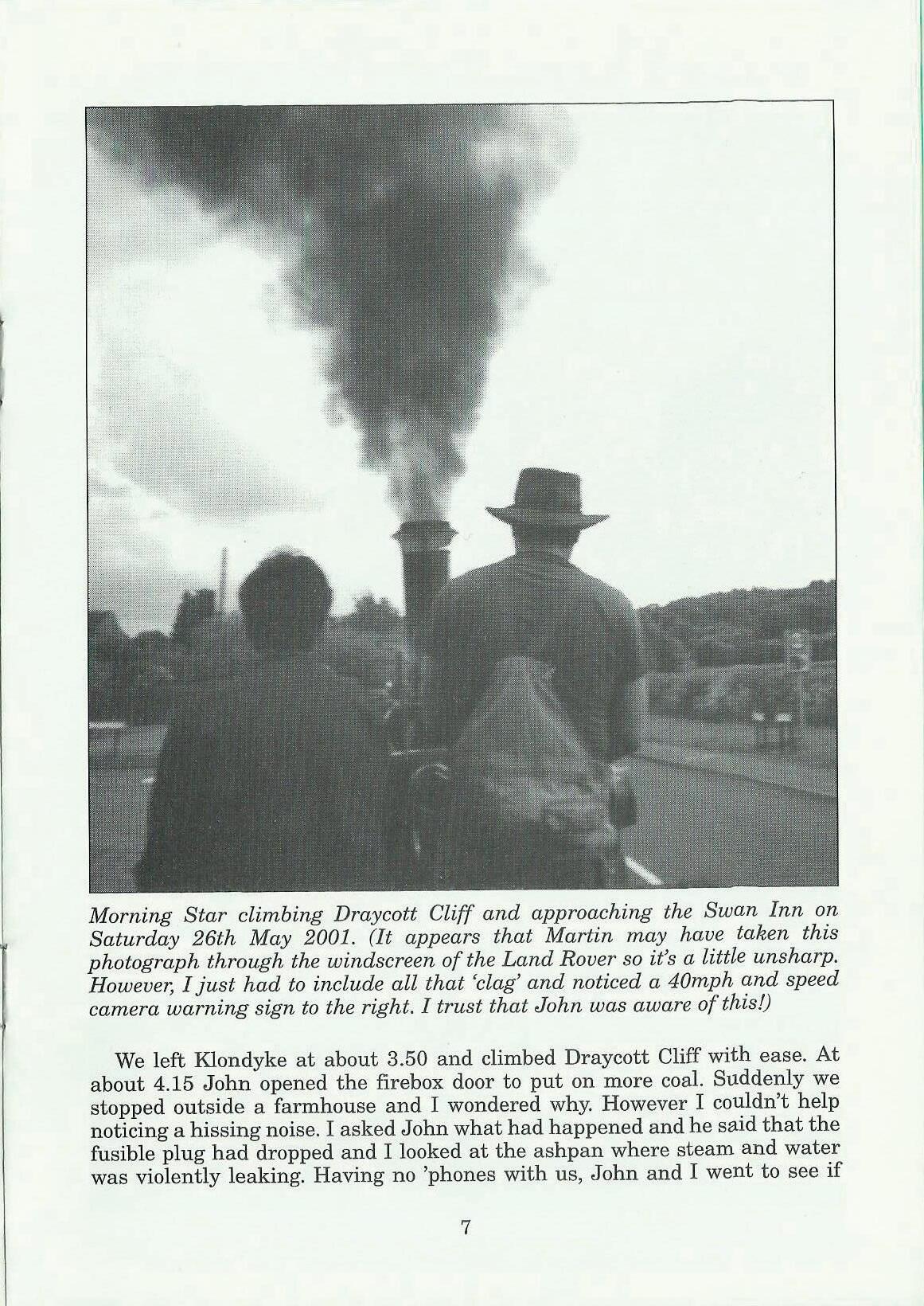 Morning Star climbing Draycott Cliff and approaching the Swan Inn on Saturday 26th May 2001. (It appears that Martin may have taken this photograph through the windscreen of the Land Rover so it's a little unsharp. However, I just had to include all that 'clag' and noticed a 40mph and speed camera warning sign to the right. I trust that John was aware of this!)