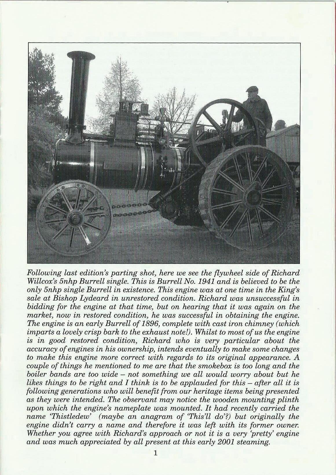 Following last edition's parting shot, here we see the fiywheel side of Richard Willcox's 5nhp Burrell single. This is Burrell No. 1941 and is believed to be the only 5nhp single Burrell in existence. This engine was at one time in the King's sale at Bishop Lydeard in unrestored condition. Richard was unsuccessful in bidding for the engine at that time, but on hearing that it was again on the market, now in restored condition, he was successful in obtaining the engine. The engine is an early Burrell of 1896, complete with cast iron chimney (which imparts a lovely crisp bark to the exhaust note!). Whilst to most of us the engine is in good restored condition, Richard who is very particular about the accuracy of engines in his ownership, intends eventually to make some changes to make this engine more correct with regards to its original appearance. A couple of things he mentioned to me are that the smoke box is too long and the boiler bands are too wide - not something we all would worry about but he likes things to be right and I think is to be applauded for this - after all it is following generations who will benefit from our heritage items being presented as they were intended. The observant may notice the wooden mounting plinth upon which the engine's nameplate was mounted. It had recently carried the name 'Thistledew' (maybe an anagram of 'This'll do'?) but originally the engine didn't carry a name and therefore it was left with its former owner. Whether you agree with Richard's approach or not it is a very 'pretty' engine and was much appreciated by all present at this early 2001 steaming.