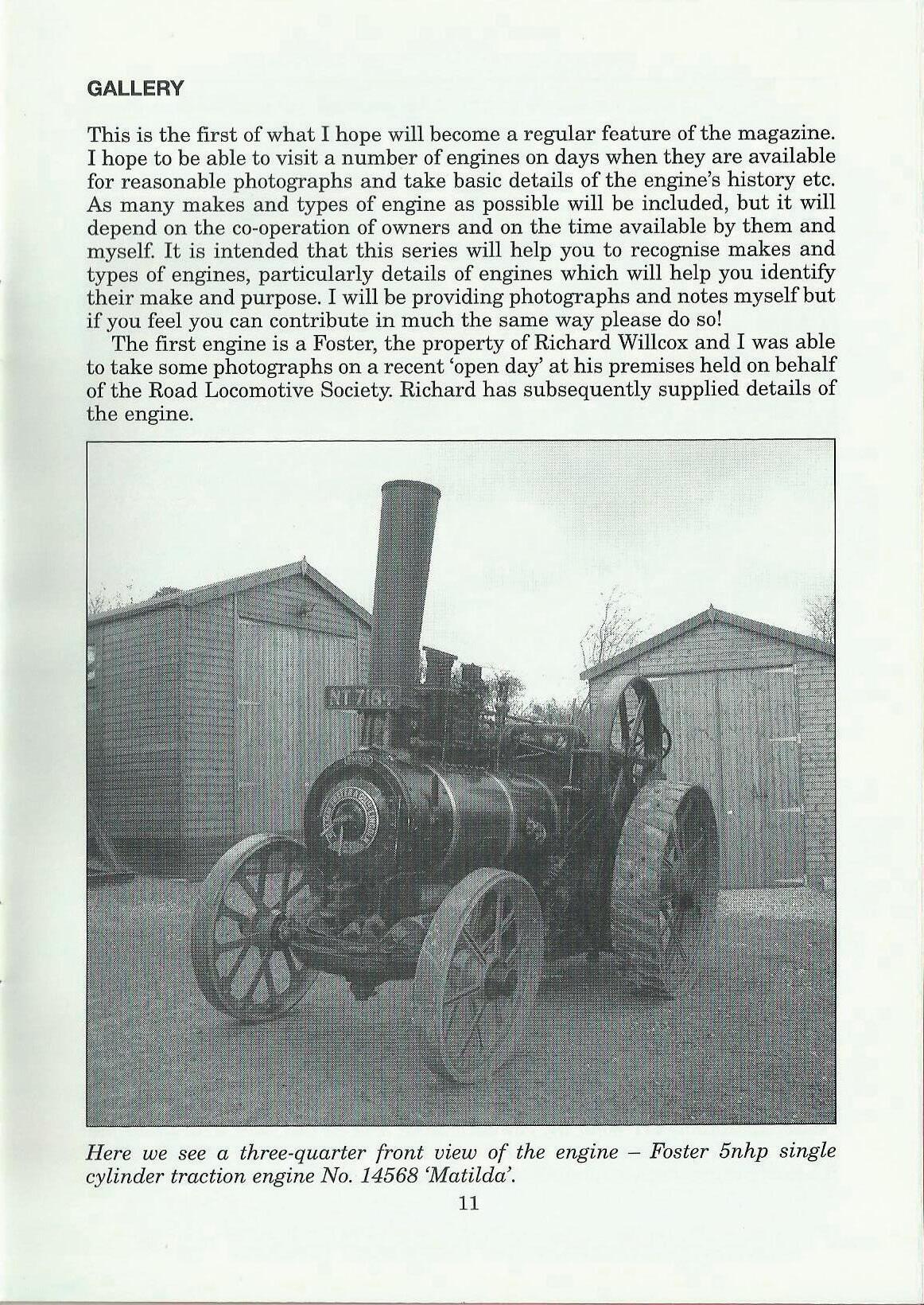 This is the first of what I hope will become a regular feature of the magazine. I hope to be able to visit a number of engines on days when they are available for reasonable photographs and take basic details of the engine's history etc. As many makes and types of engine as possible will be included, but it will depend on the co-operation of owners and on the time available by them and myself It is intended that this series will help you to recognise makes and types of engines, particularly details of engines which will help you identify their make and purpose. I will be providing photographs and notes myself but if you feel you can contribute in much the same way please do so!