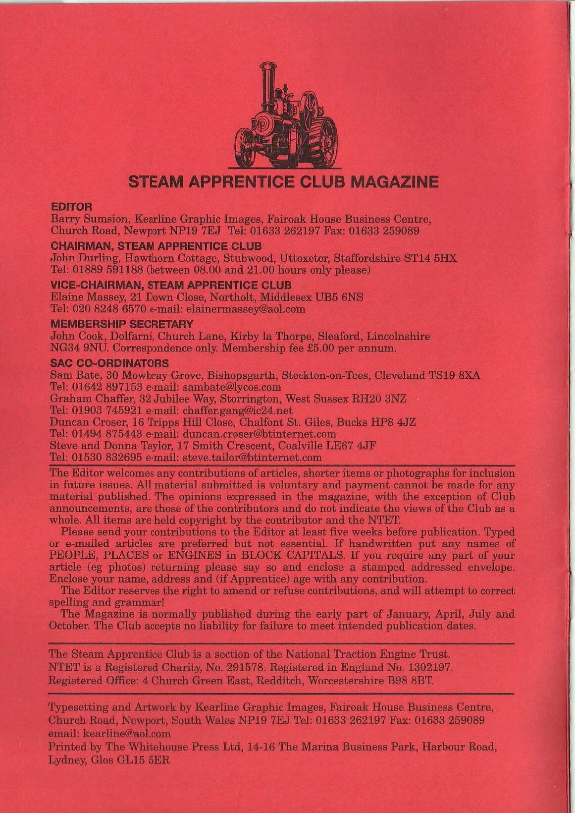 The Steam Apprentice Club is a section of the National Traction Engine Trust. NTET is a Registered Chwi.ty, No. 291578. Registered in England No. 1302197. Registered Office: 4 Church Green East, Redditch, Worcestershire B98 SET.