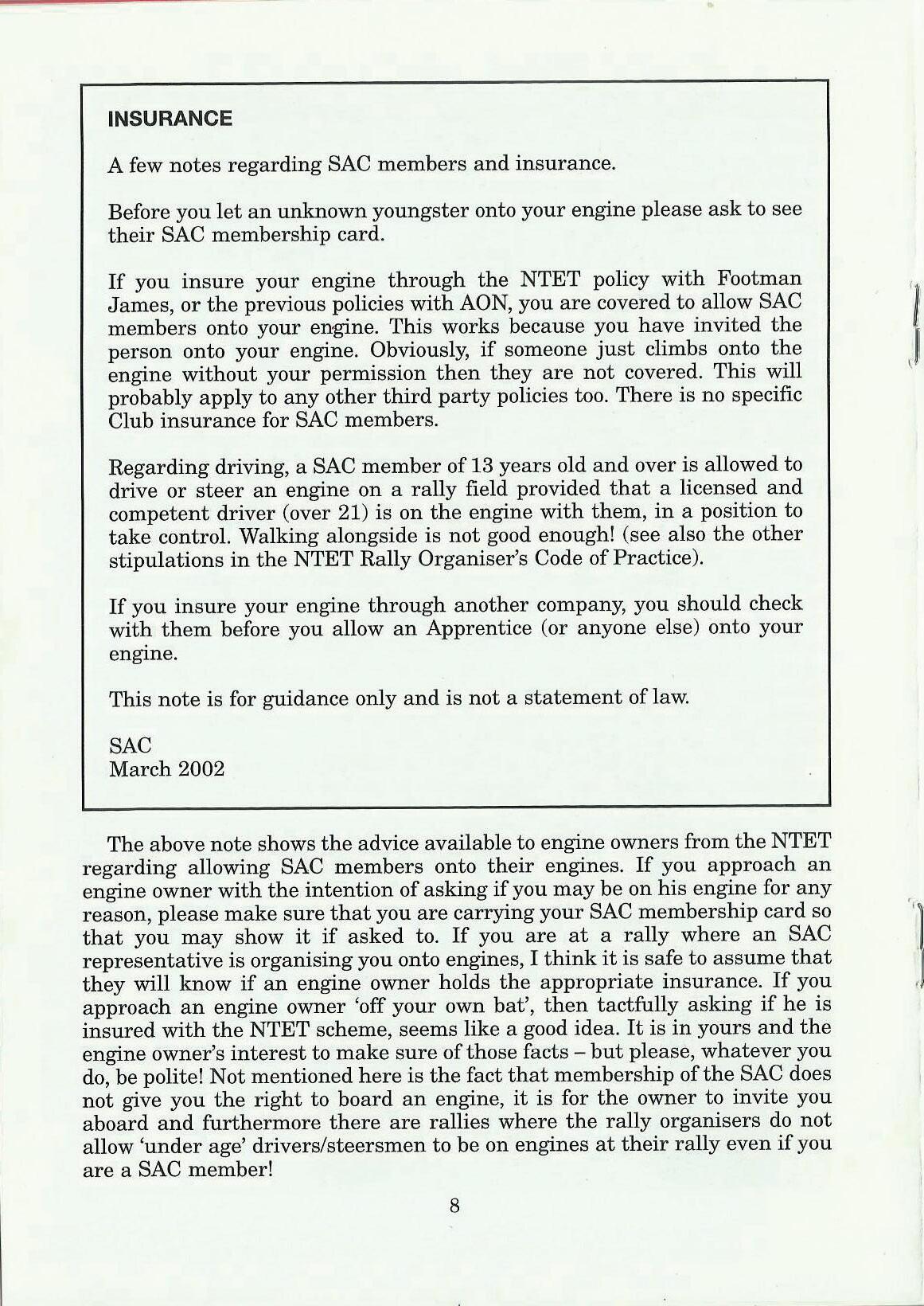 The above note shows the advice available to engine owners from the NTET regarding allowing SAC members onto their engines. If you approach an engine owner with the intention of asking if you may be on his engine for any reason, please make sure that you are carrying your SAC membership card so that you may show it if asked to. If you are at a rally where an SAC representative is organising you onto engines, I think it is safe to assume that they will know if an engine owner holds the appropriate insurance. If you approach an engine owner 'off your own bat', then tactfully asking if he is insured with the NTET scheme, seems like a good idea. It is in yours and the engine owner's interest to make sure of those facts - but please, whatever you do, be polite! Not mentioned here is the fact that membership of the SAC does not give you the right to board an engine, it is for the owner to invite you aboard and furthermore there are rallies where the rally organisers do not allow 'under age' drivers/steersmen to be on engines at their rally even if you are a SAC member!