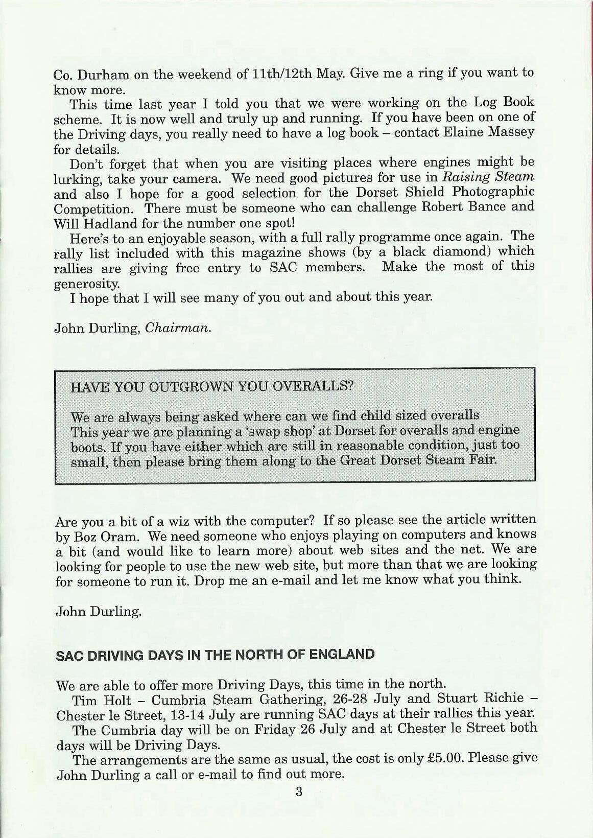 We are able to offer more Driving Days, this time in the north. Tim Holt -Cumbria Steam Gathering, 26-28 July and Stuart RichieChester le Street, 13-14 July are running SAC days at their rallies this year. The Cumbria day will be on Friday 26 July and at Chester le Street both days will be Driving Days. The arrangements are the same as usual, the cost is only £5.00. Please give John Durling a call or e-mail to find out more.