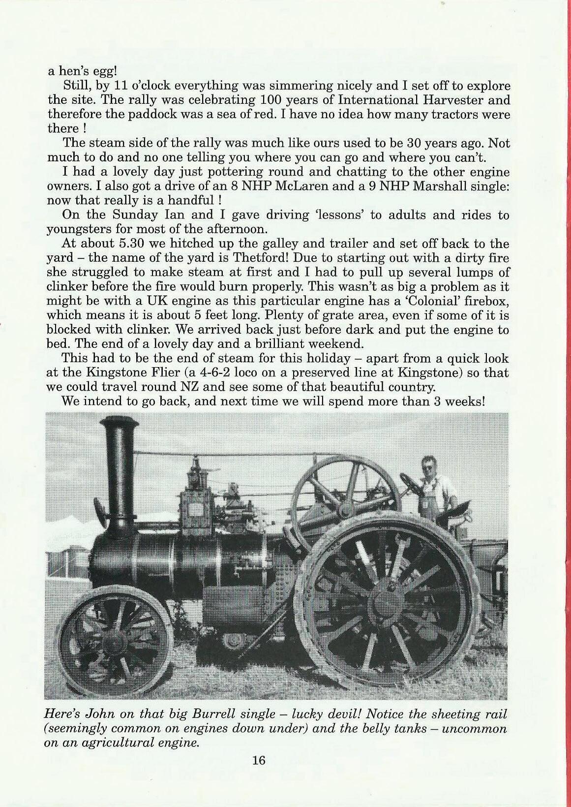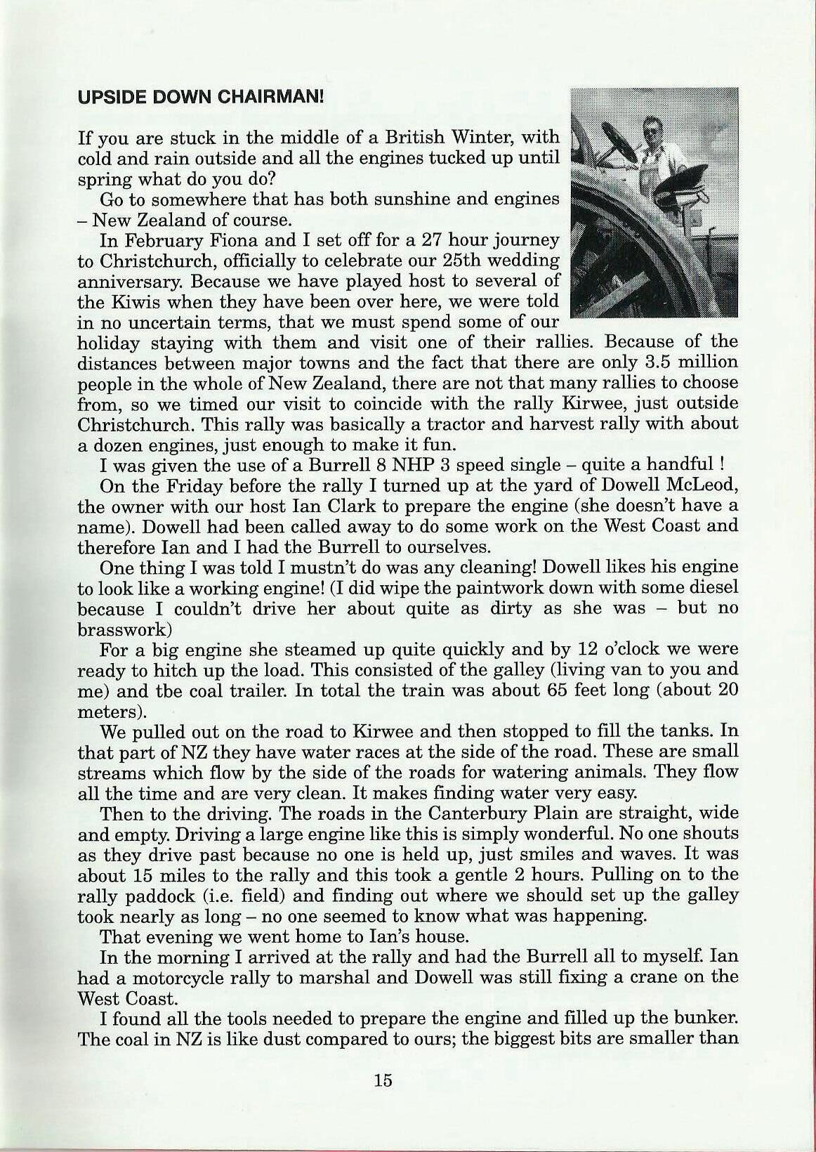 In February Fiona and I set off for a 27 hour journey • to Christchurch, officially to celebrate our 25th wedding anniversary. Because we have played host to several of the Kiwis when they have been over here, we were told in no uncertain terms, that we must spend some of our holiday staying with them and visit one of their rallies. Because of the distances between major towns and the fact that there are only 3.5 million people in the whole of New Zealand, there are not that many rallies to choose from, so we timed our visit to coincide with the rally Kirwee, just outside Christchurch. This rally was basically a tractor and harvest rally with about a dozen engines, just enough to make it fun.