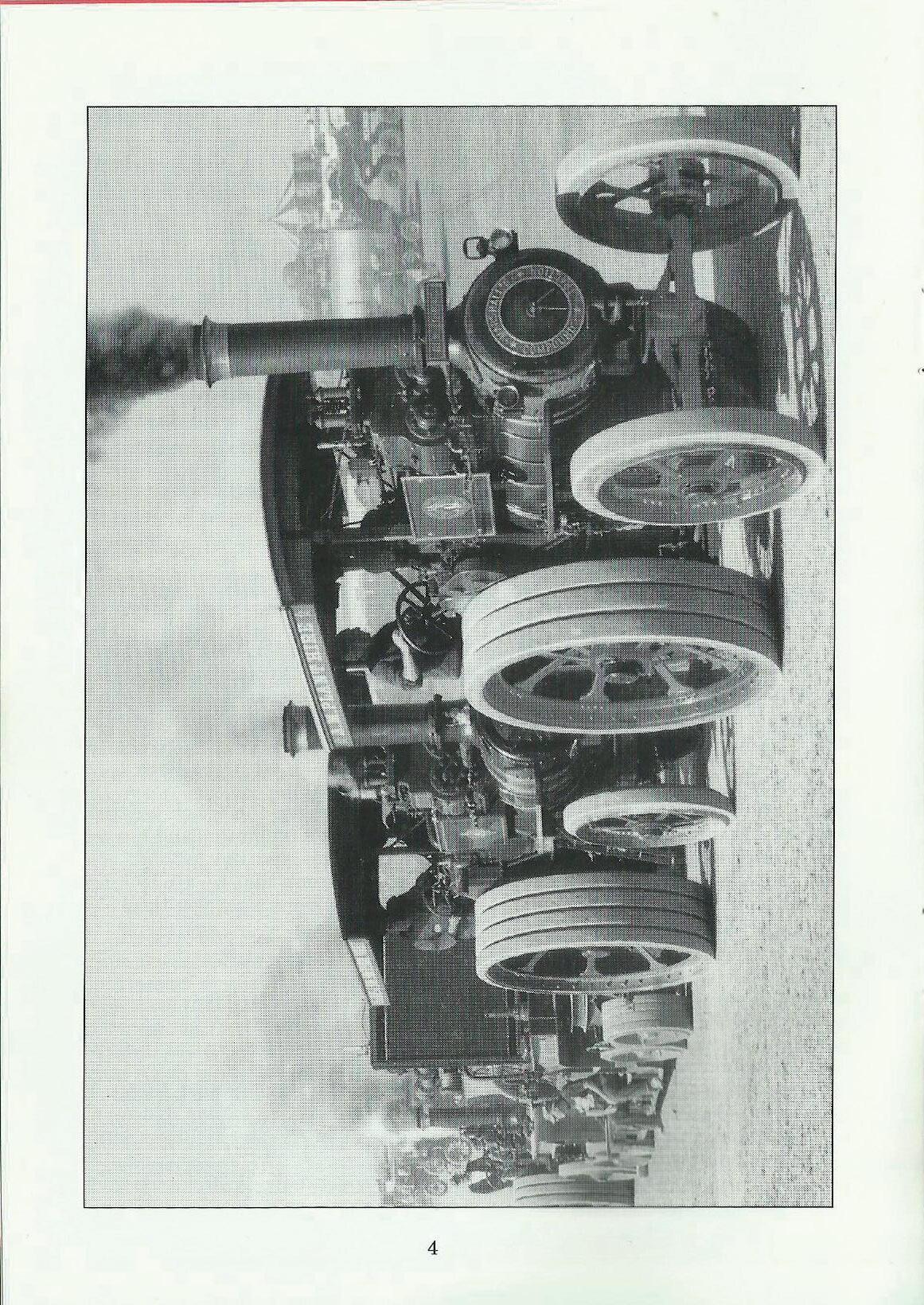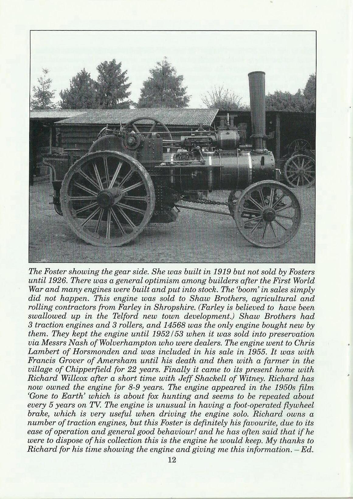 The Foster showing the gear side. She was built in 1919 but not sold by Fosters until 1926. There was a general optimism among builders after the First World War and many engines were built and put into stock. The (boom' in sales simply did not happen. This engine was sold to Shaw Brothers, agricultural and rolling contractors from Farley in Shropshire. (Farley is believed to have been swallowed up in the Telford new town development.) Shaw Brothers had 3 traction engines and 3 rollers, and 14568 was the only engine bought new by them. They kept the engine until 1952 I 53 when it was sold into preservation via Messrs Nash of Wolverhampton who were dealers. The engine went to Chris Lambert of Horsmonden and was included in his sale in 1955. It was with Francis Grover of Amersham until his death and then with a farmer in the village of Chipperfield for 22 years. Finally it came to its present home with Richard Willcox after a short time with Jeff Shackell of Witney. Richard has now owned the engine for 8-9 years. The engine appeared in the 1950s film 'Gone to Earth' which is about fox hunting and seems to be repeated about every 5 years on TV. The engine is unusual in having a foot-operated fiywheel brake, which is very useful when driving the engine solo. Richard owns a number of traction engines, but this Foster is definitely his favourite, due to its ease of operation and general good behaviour! and he has often said that if he were to dispose of his collection this is the engine he would keep. My thanks to Richard for his time showing the engine and giving me this information. - Ed.