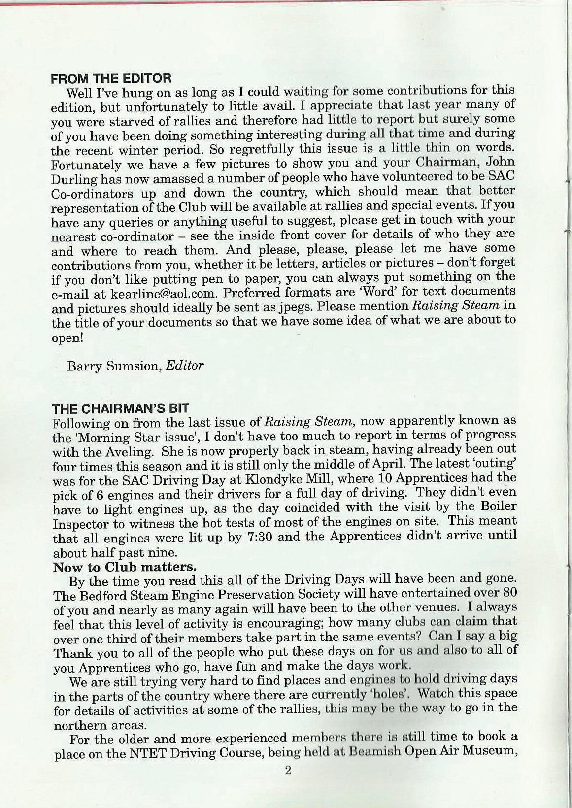 Well I've hung on as long as I could waiting for some contributions for this edition, but unfortunately to little avail. I appreciate that last year many of you were starved of rallies and therefore had little to report but surely some of you have been doing something interesting during all that time and during the recent winter period. So regretfully this issue is a little thin on words. Fortunately we have a few pictures to show you and your Chairman, John Durling has now amassed a number of people who have volunteered to be SAC Co-ordinators up and down the country, which should mean that better representation of the Club will be available at rallies and special events. If you have any queries or anything useful to suggest, please get in touch with your nearest co-ordinator - see the inside front cover for details of who they are and where to reach them. And please, please, please let me have some contributions from you, whether it be letters, articles or pictures - don't forget if you don't like putting pen to paper, you can always put something on the e-mail at kearline@aol.com. Preferred formats are 'Word' for text documents and pictures should ideally be sent as jpegs. Please mention Raising Steam in the title of your documents so that we have some idea of what we are about to open!