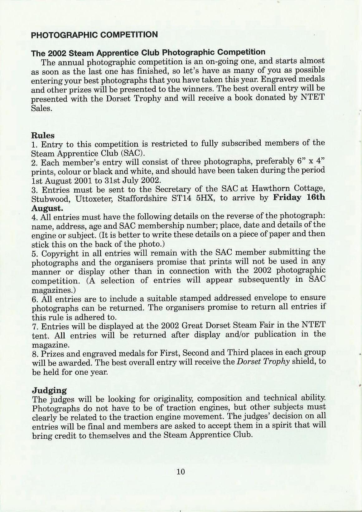 7. Entries will be displayed at the 2002 Great Dorset Steam Fair in the NTET tent. All entries will be returned after display and/or publication in the magazine.