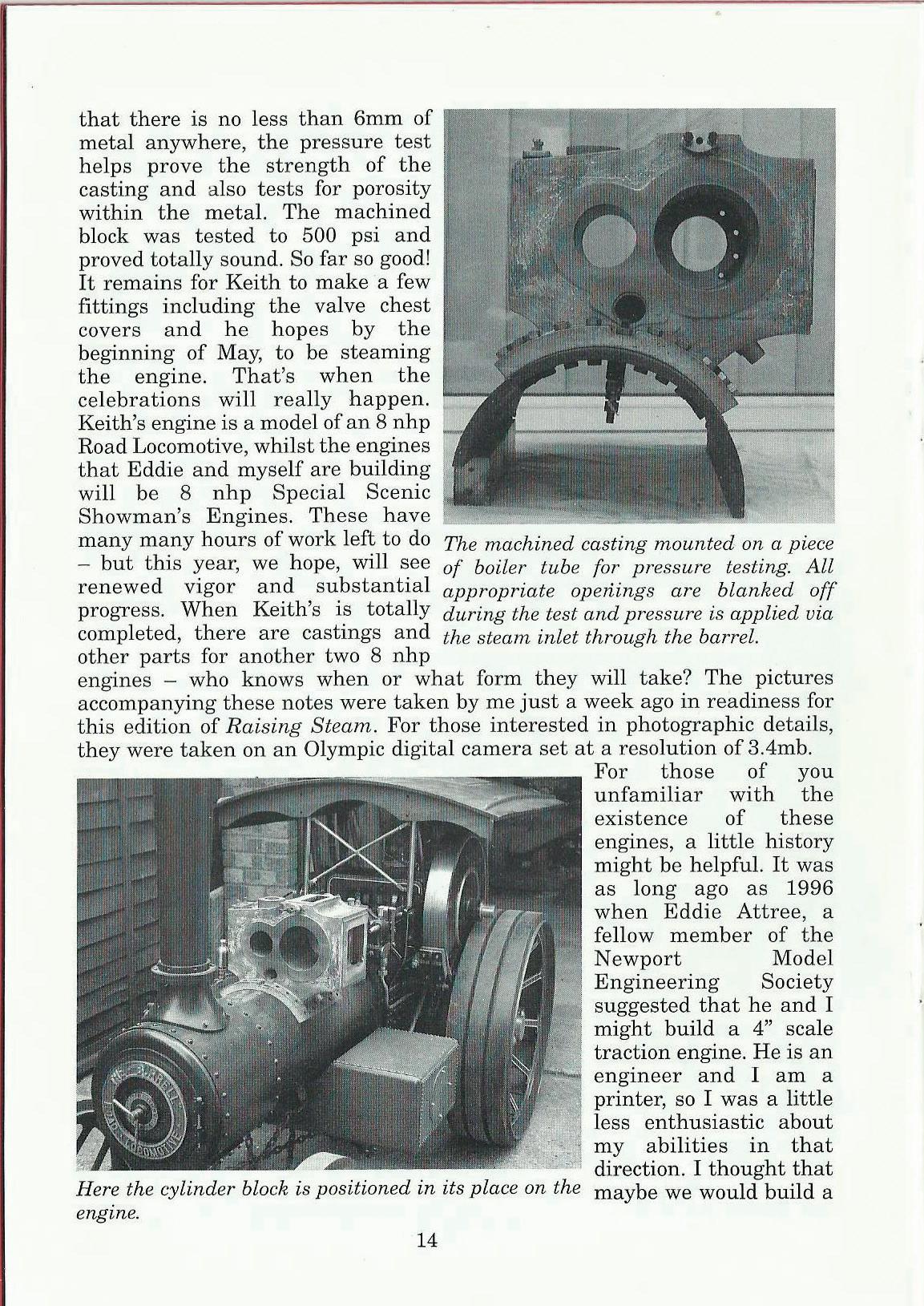 that there is no less than 6mm of metal anywhere, the pressure test helps prove the strength of the casting and also tests for porosity within the metal. The machined block was tested to 500 psi and proved totally sound. So far so good! It remains for Keith to make a few fittings including the valve chest covers and he hopes by the beginning of May, to be steaming the engine. That's when the celebrations will really happen. Keith's engine is a model of an 8 nhp Road Locomotive, whilst the engines that Eddie and myself are building will be 8 nhp Special Scenic Showman's Engines. These have many many hours of work left to do The machined casting mounted on a piece - but this year, we hope, will see of boiler tube for pressure testing. All renewed vigor and substantial appropriate openings are blanked off progTess. When Keith's is totally during the test and pressure is applied via completed, there are castings and the steam inlet through the barrel. other parts for another two 8 nhp engines - who knows when or what form they will take? The pictures accompanying these notes were taken by me just a week ago in readiness for this edition of Raising Steam. For those interested in photographic details, they were taken on an Olympic digital camera set at a resolution of 3.4mb. For those of you unfamiliar with the existence of these engines, a little history m.ight be helpful. It was as long ago as 1996 when Eddie Attree, a fellow member of the Newport Model Engineering Society suggested that he and I might build a 4" scale traction engine. He is an engineer and I am a printer, so I was a little less enthusiastic about my abilities in that direction. I thought that Here the cylinder block is positioned in its place on the maybe we would build a engine.