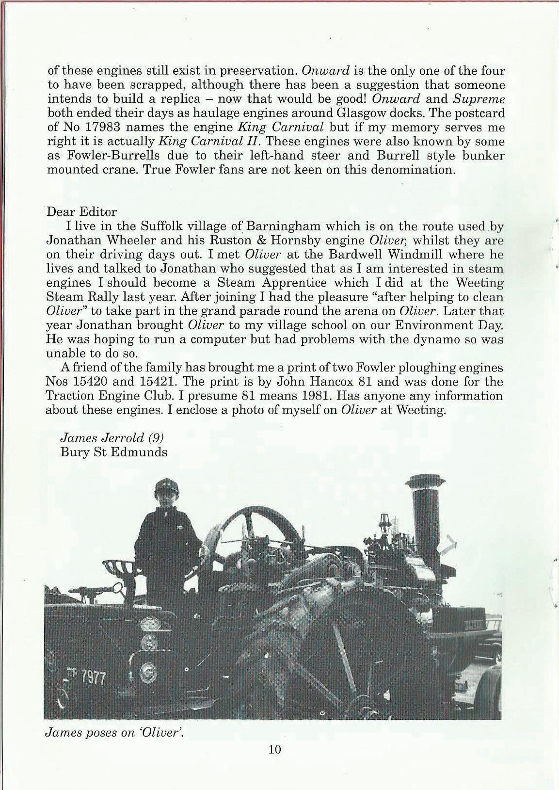 A friend of the family has brought me a print of two Fowler ploughing engines Nos 15420 and 15421. The print is by John Hancox 81 and was done for the Traction Engine Club. I presume 81 means 1981. Has anyone any information about these engines. I enclose a photo of myself on Oliver at Weeting.