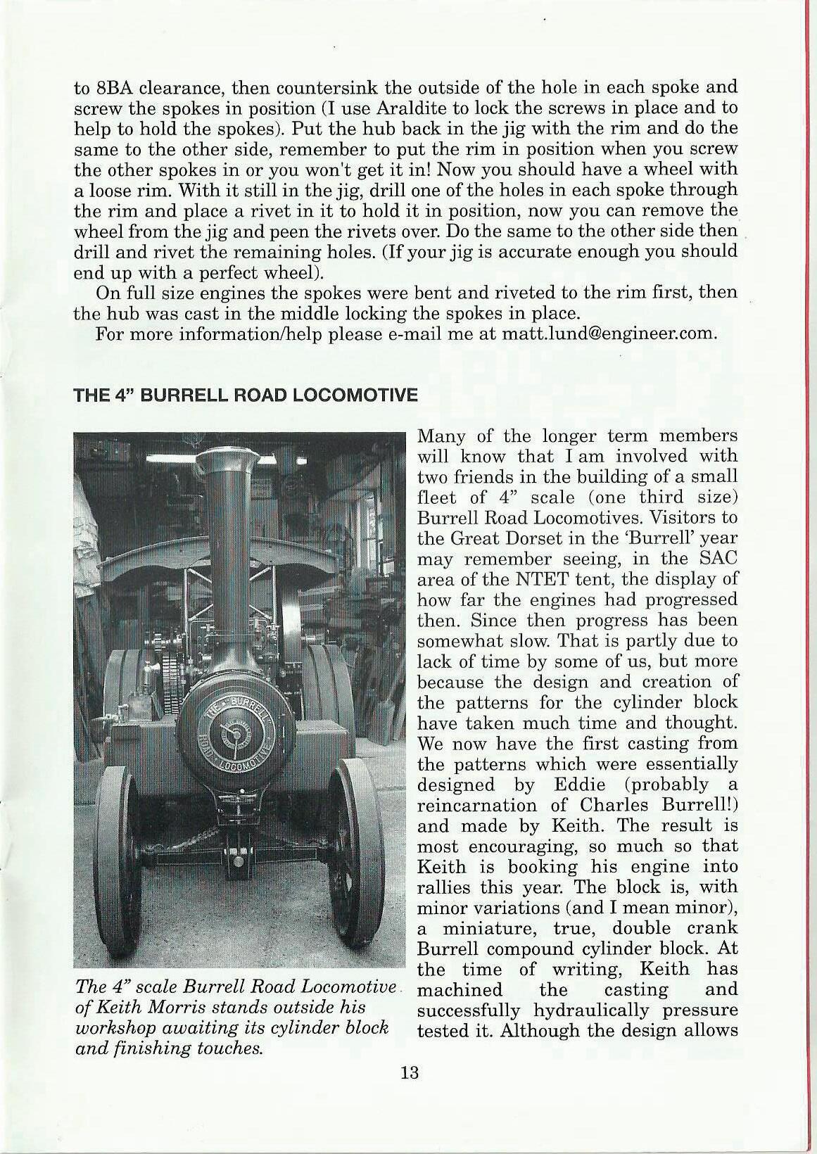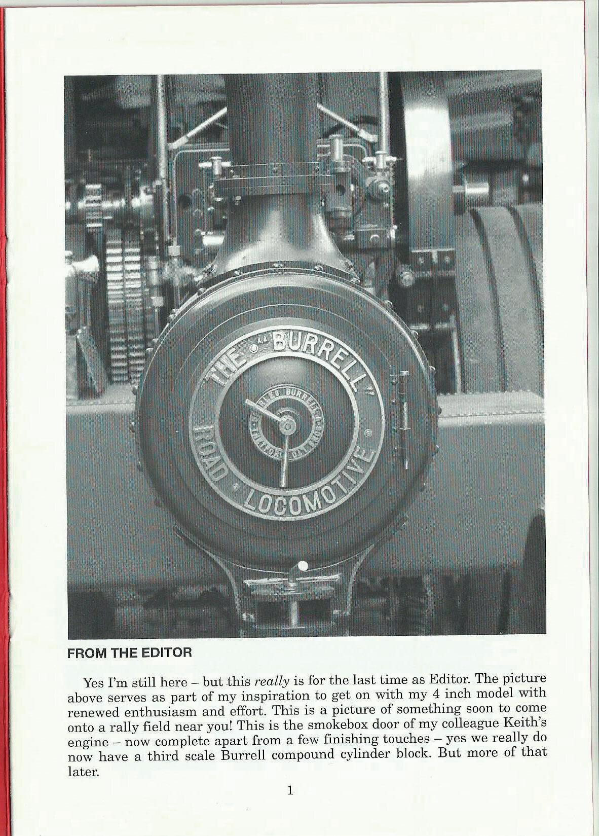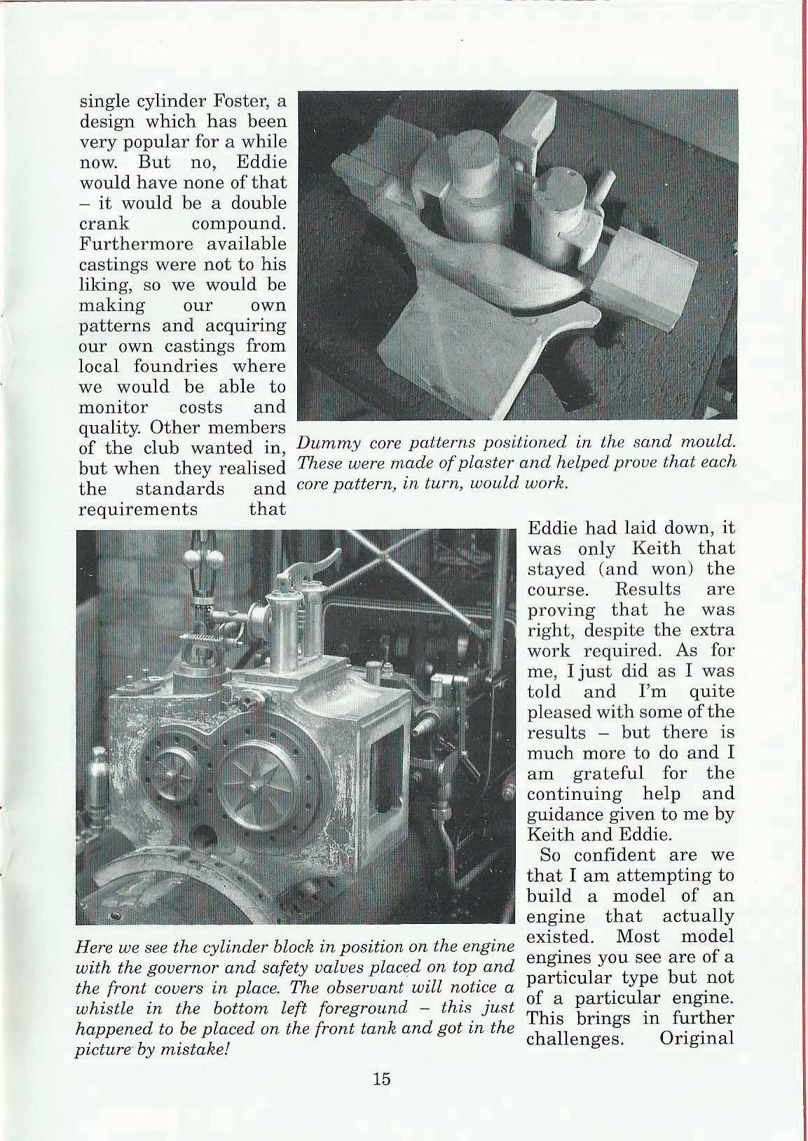 Many of the longer term members will know that I am involved with two friends in the building of a small fleet of 4" scale (one third size) Burrell Road Locomotives. Visitors to the Great Dorset in the 'Burrell' year may remember seeing, in the SAC area of the NTET tent, the display of how far the engines had progressed then. Since then progress has been somewhat slow. That is partly due to lack of time by some of us, but m.ore because the design and creation of the patterns for the cylinder block have taken much time and thought. We now have the first casting from the patterns which were essentially designed by Eddie (probably a reincarnation of Charles Burrell!) and made by Keith. The result is most encouraging, so much so that Keith is booking his engine into rallies this year. The block is, with minor variations (and I mean minor), a miniature, true, double crank Burrell compound cylinder block. At the time of writing, Keith has machined the casting and successfully hydraulically pressure tested it. Although the design allows